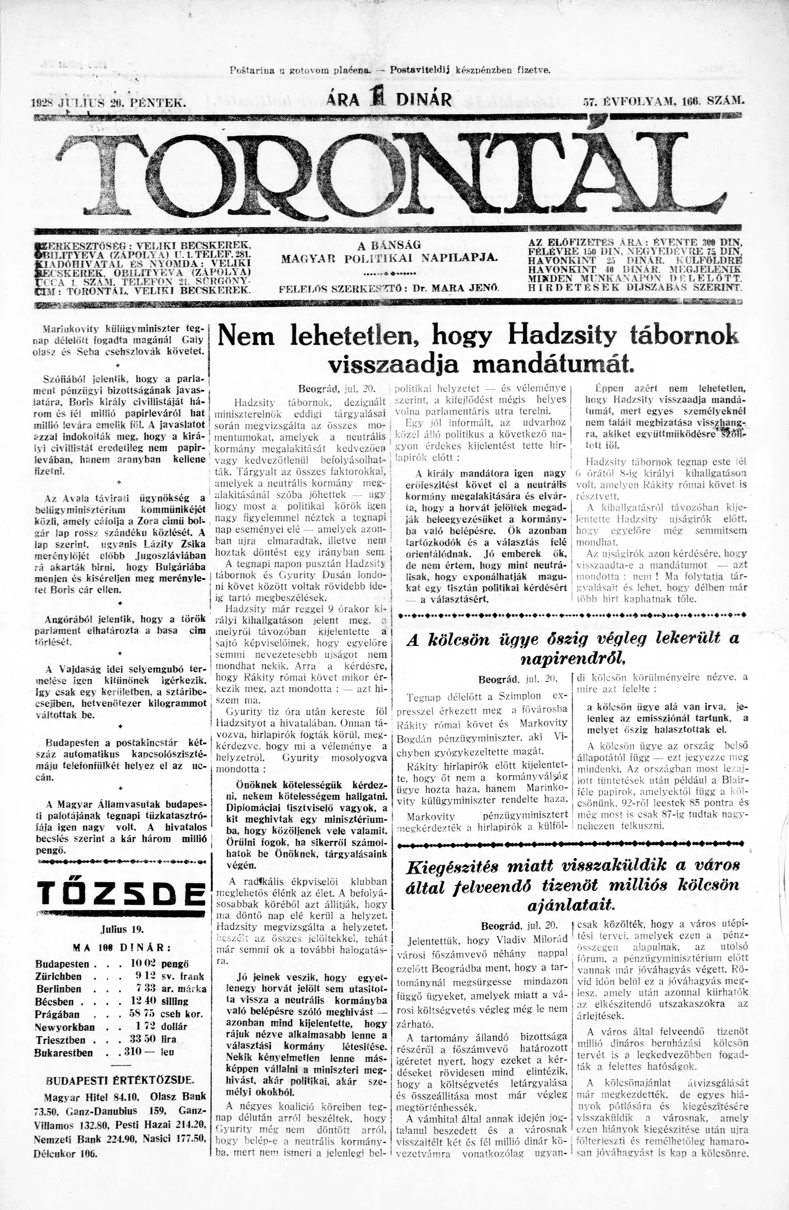 Torontál, 57. évf. 1928. július 20. 166. sz.