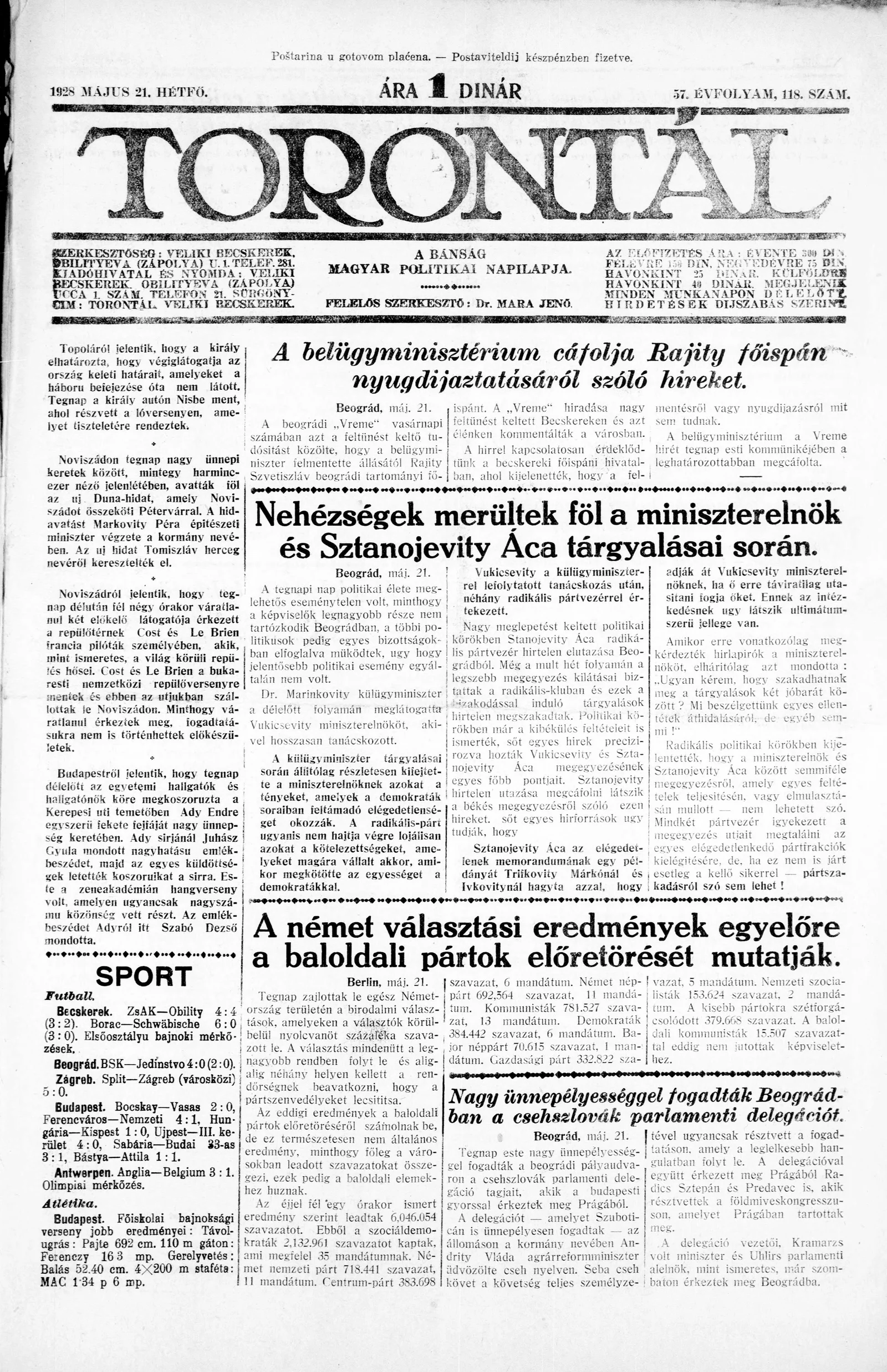 Torontál, 57. évf. 1928. május 21. 118. sz.
