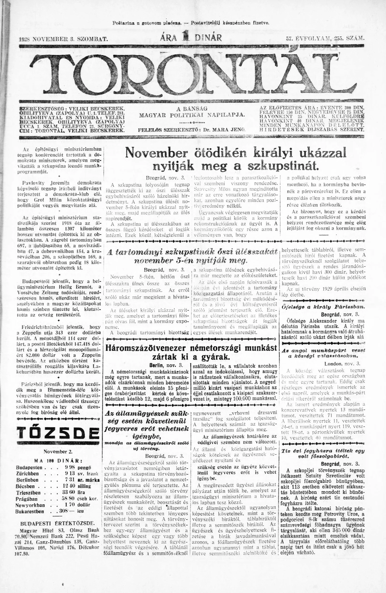 Torontál, 57. évf. 1928. november 3. 255. sz.