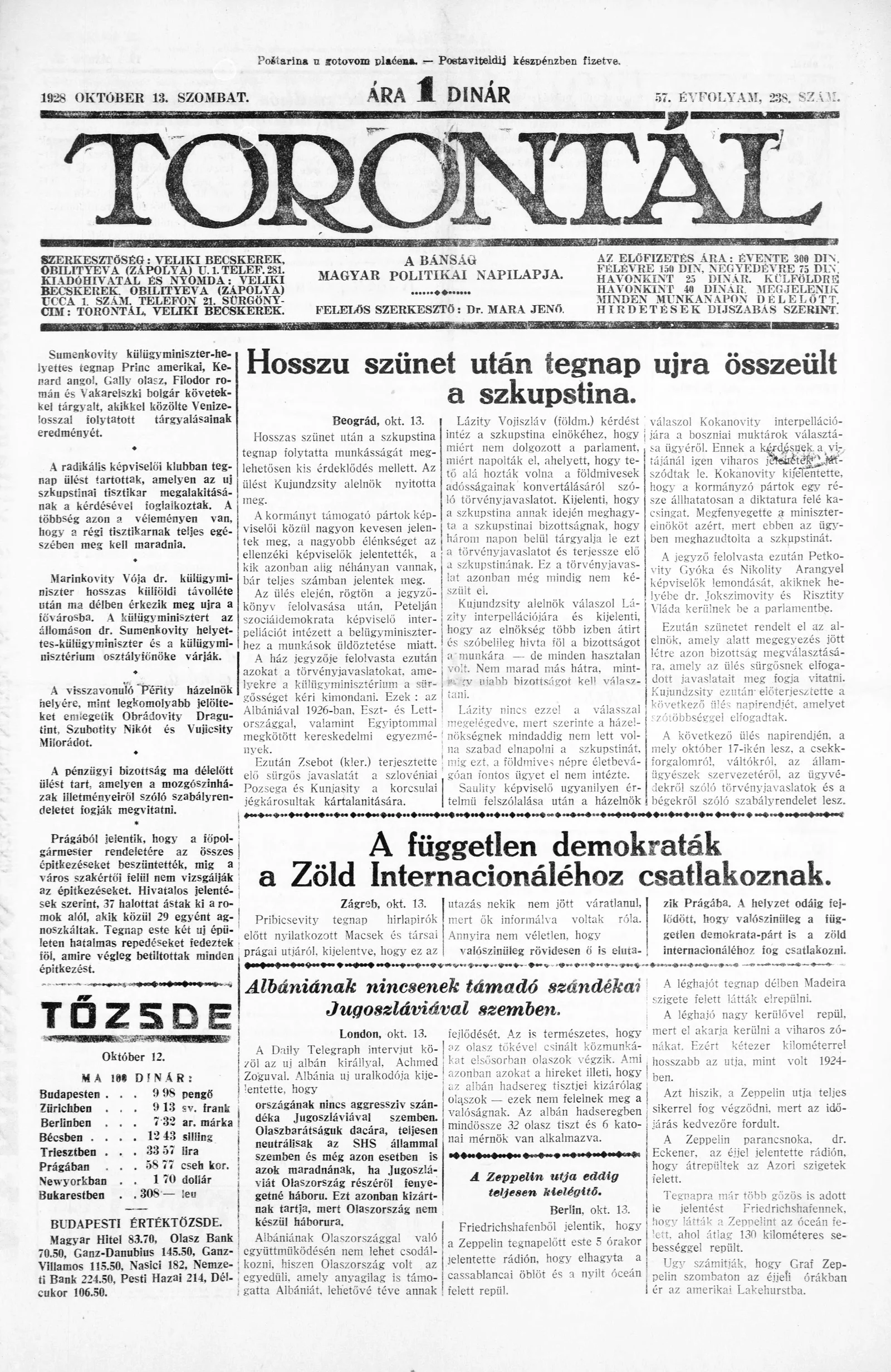 Torontál, 57. évf. 1928. október 13. 238. sz.