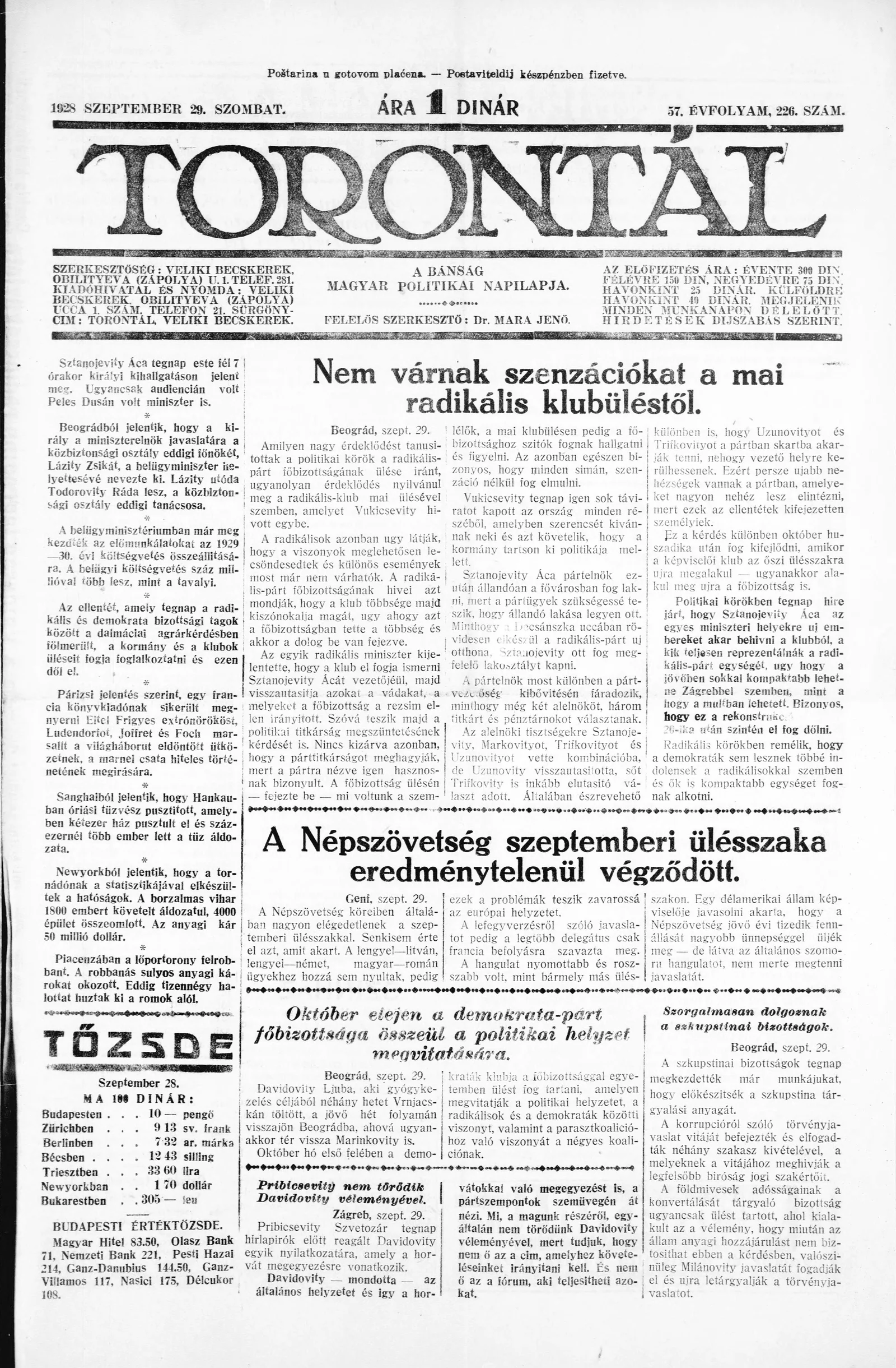 Torontál, 57. évf. 1928. szeptember 29. 226. sz.