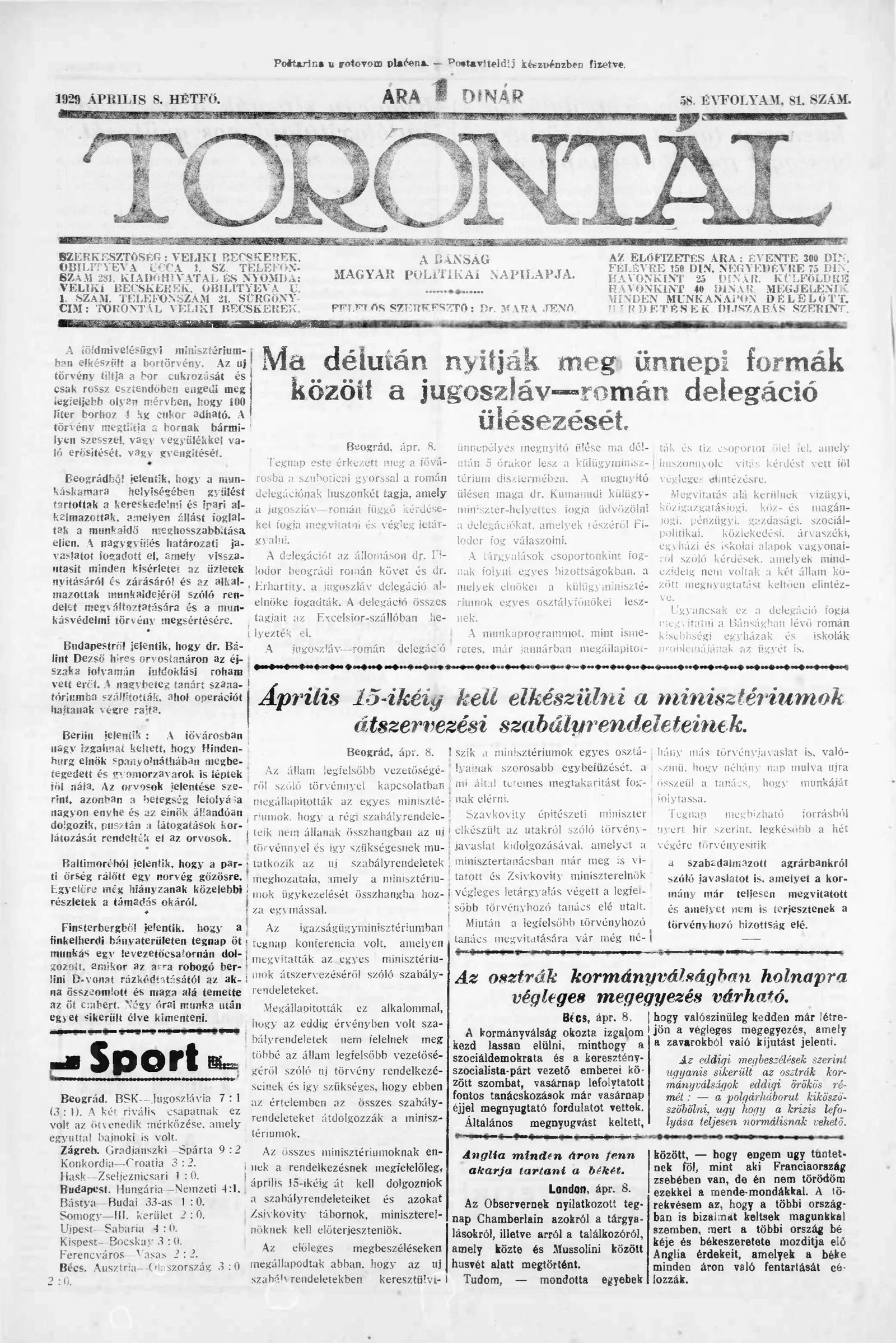 Torontál, 58. évf. 1929. április 8. 81. sz.
