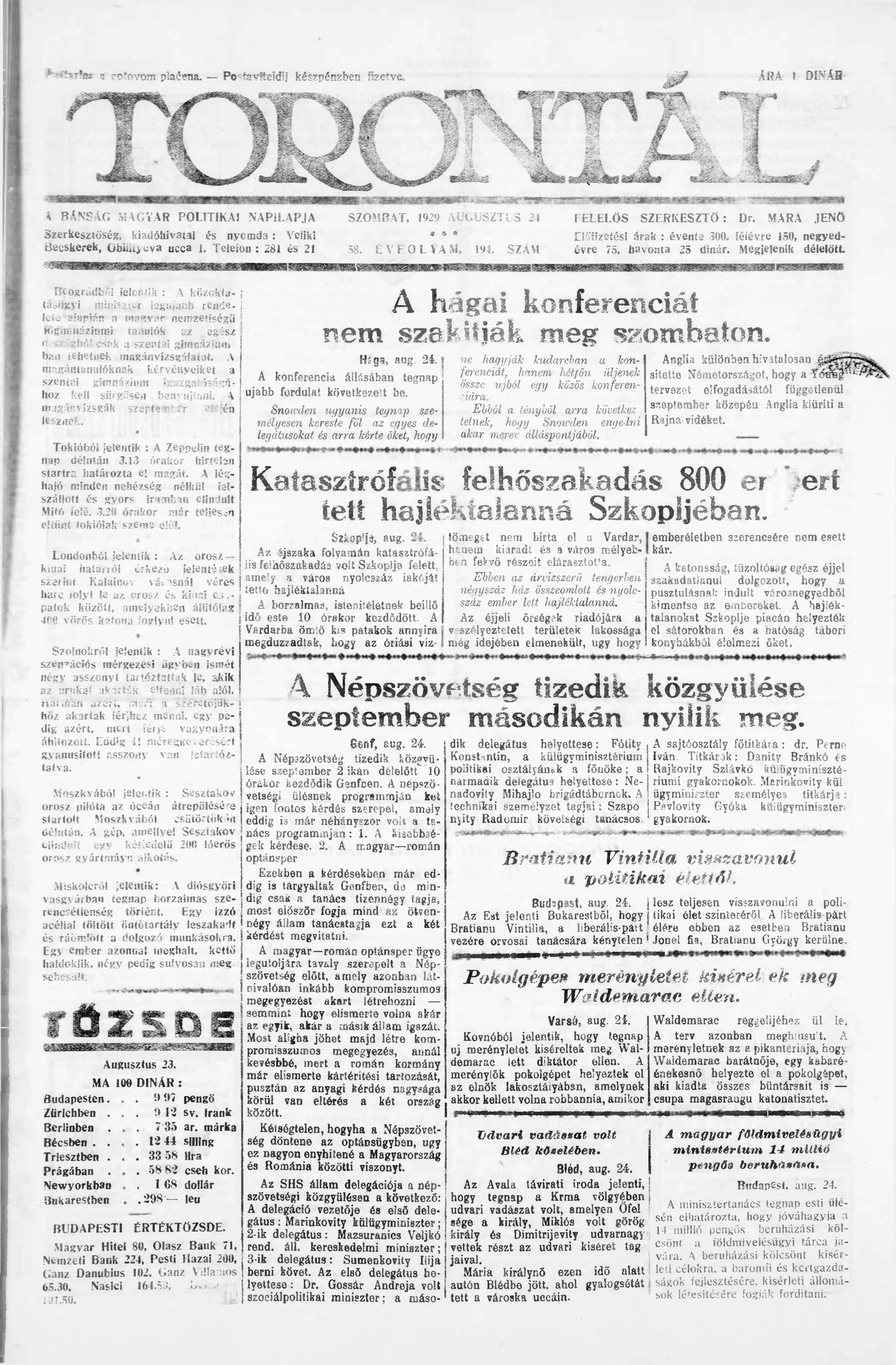 Torontál, 58. évf. 1929. augusztus 24. 194. sz.