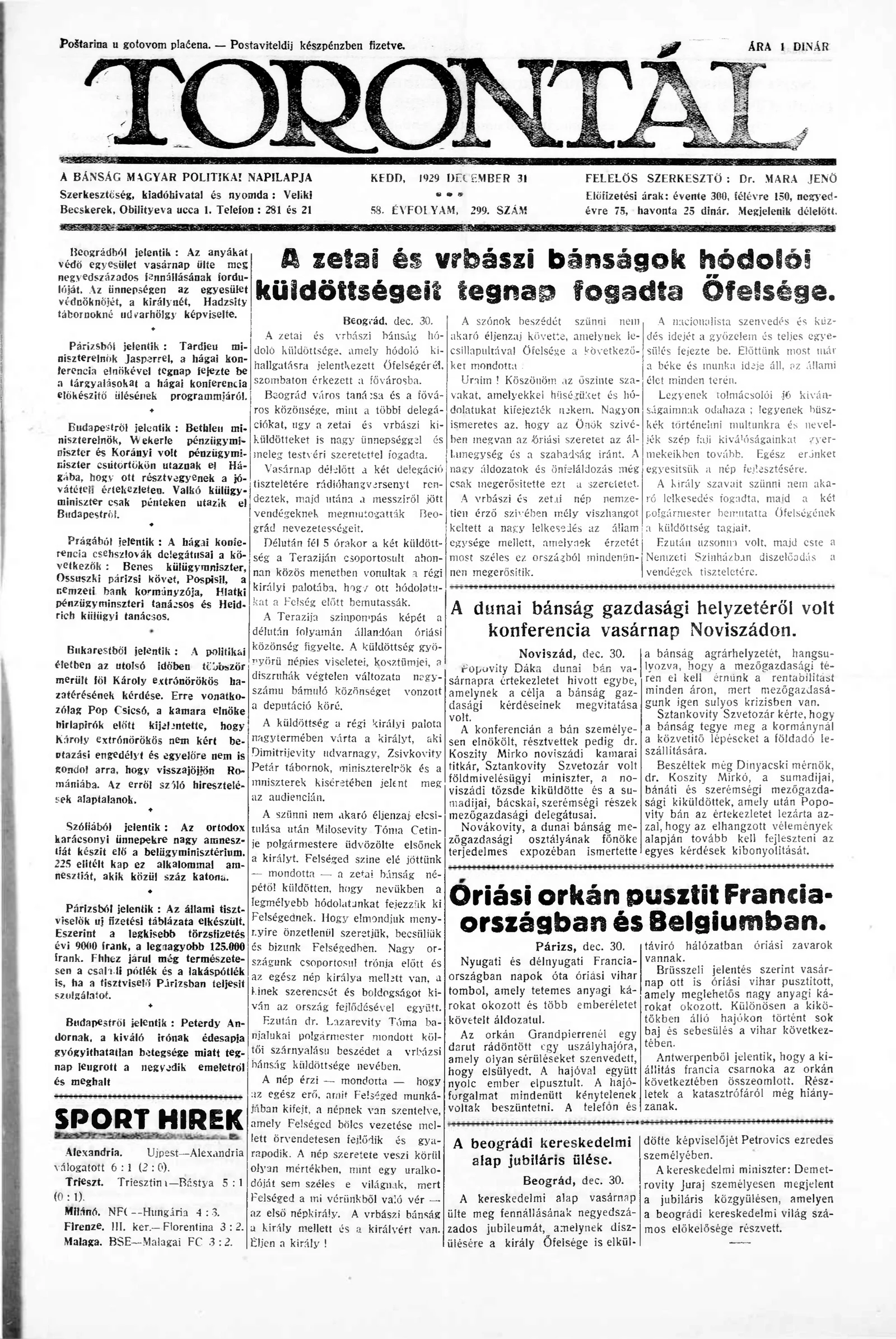 Torontál, 58. évf. 1929. december 31. 299. sz.