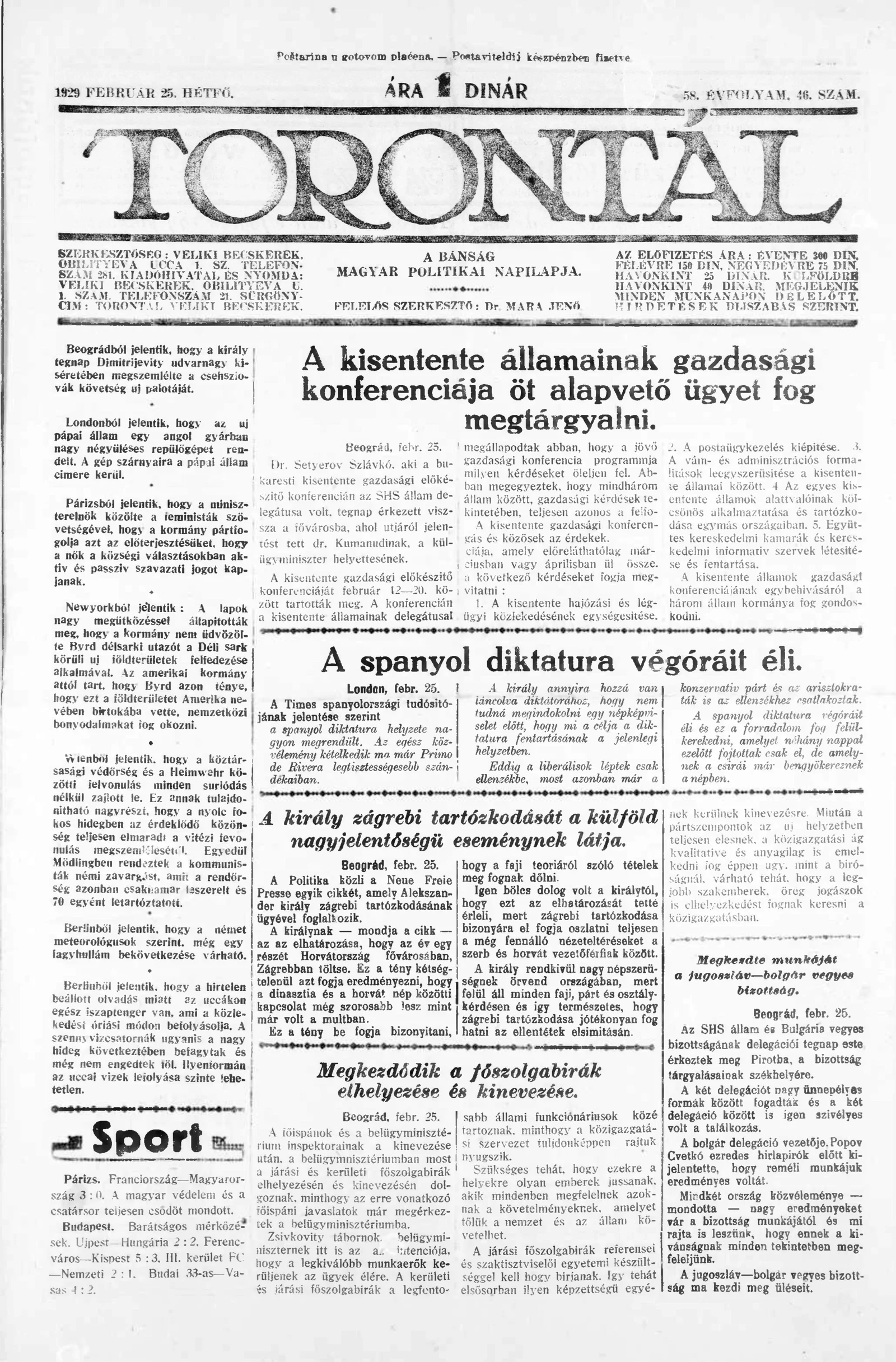 Torontál, 58. évf. 1929. február 25. 46. sz.