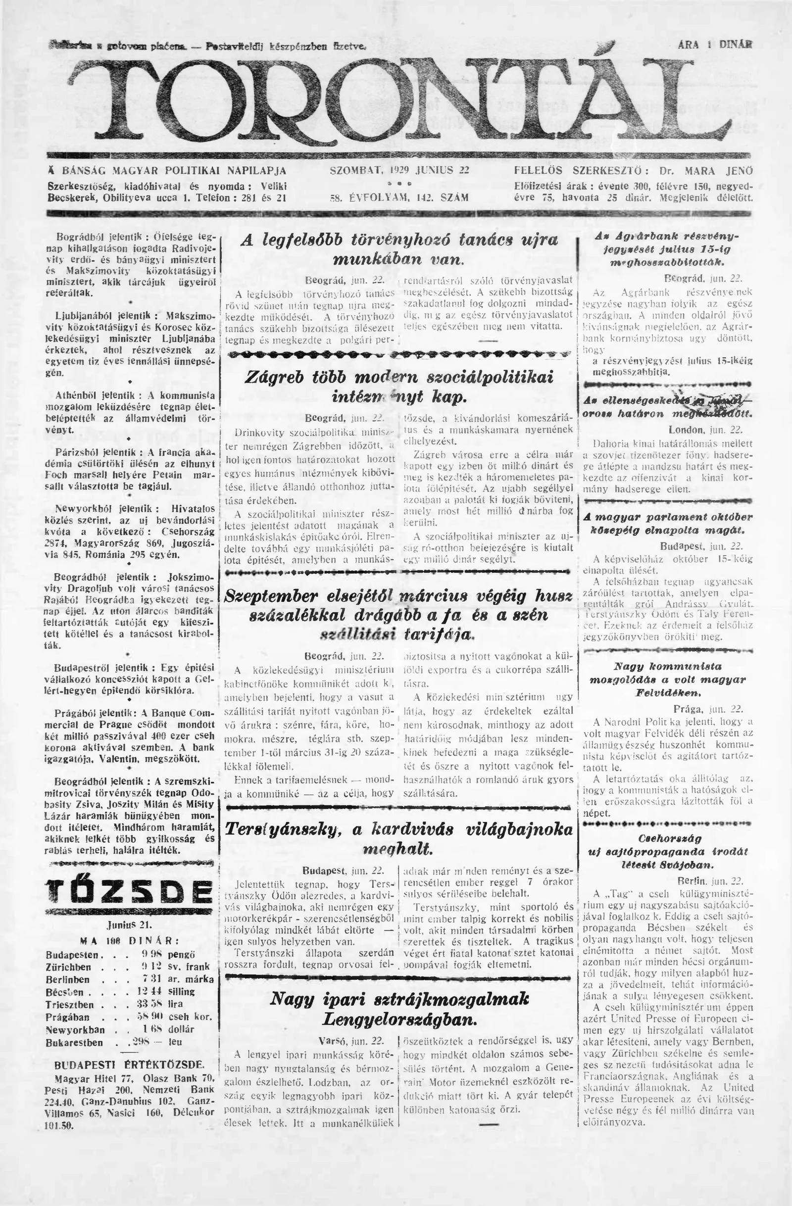Torontál, 58. évf. 1929. június 22. 142. sz.