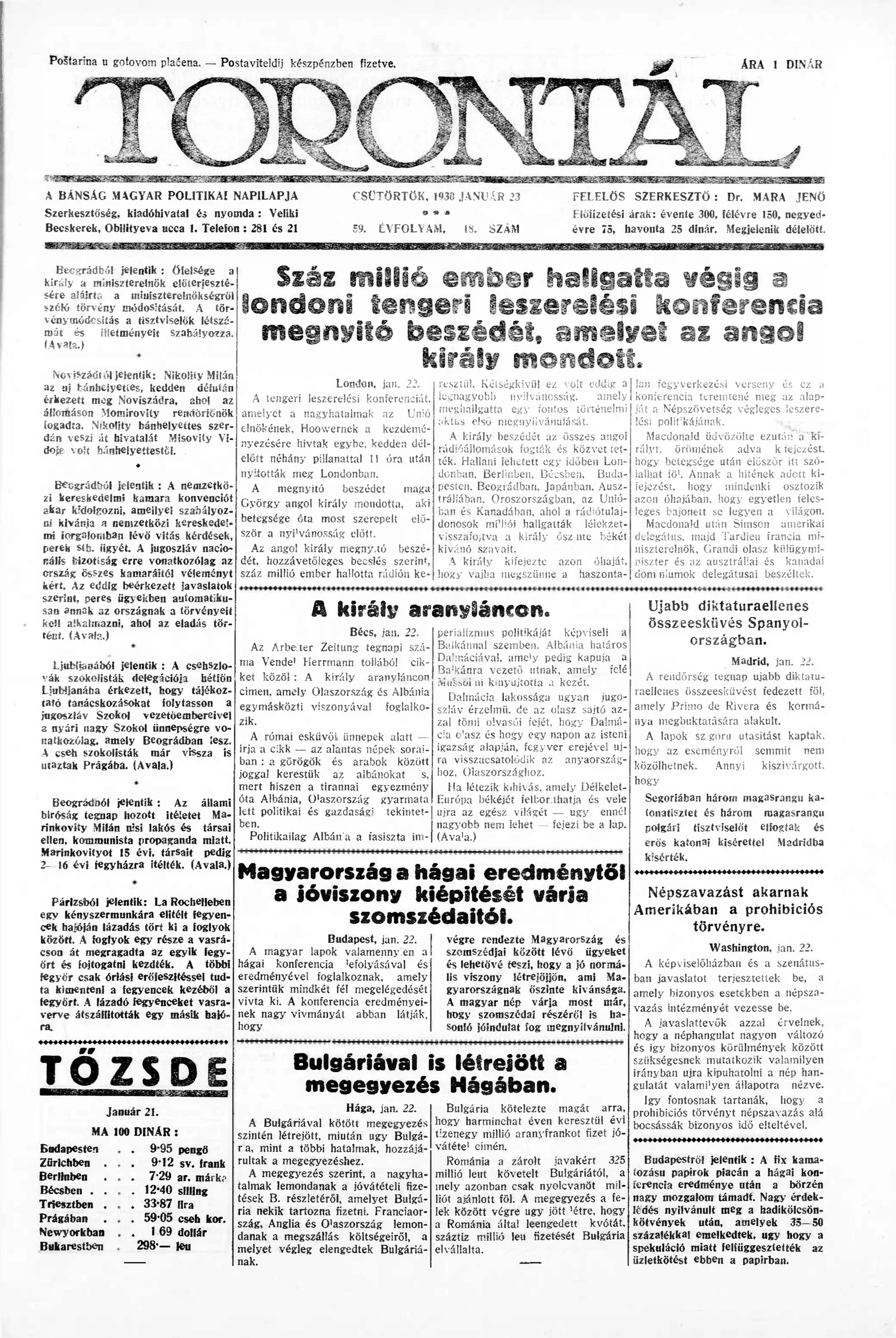 Torontál, 59. évf. 1930. január 23. 18. sz.