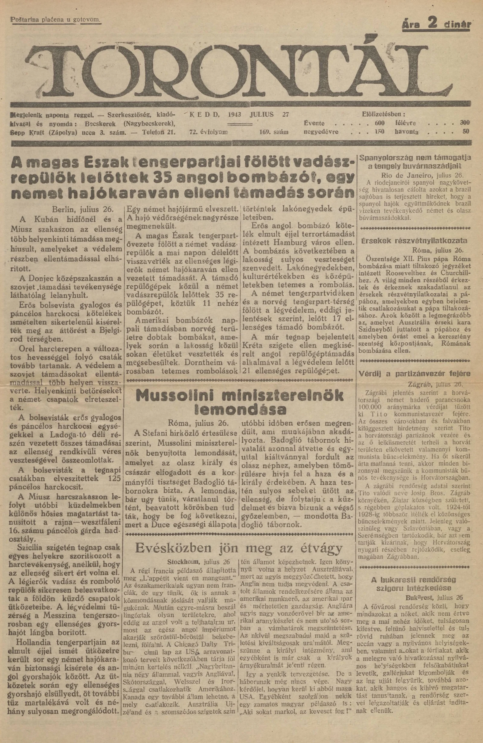 Torontál, 72. évf. 1943. július 27. 169. sz.
