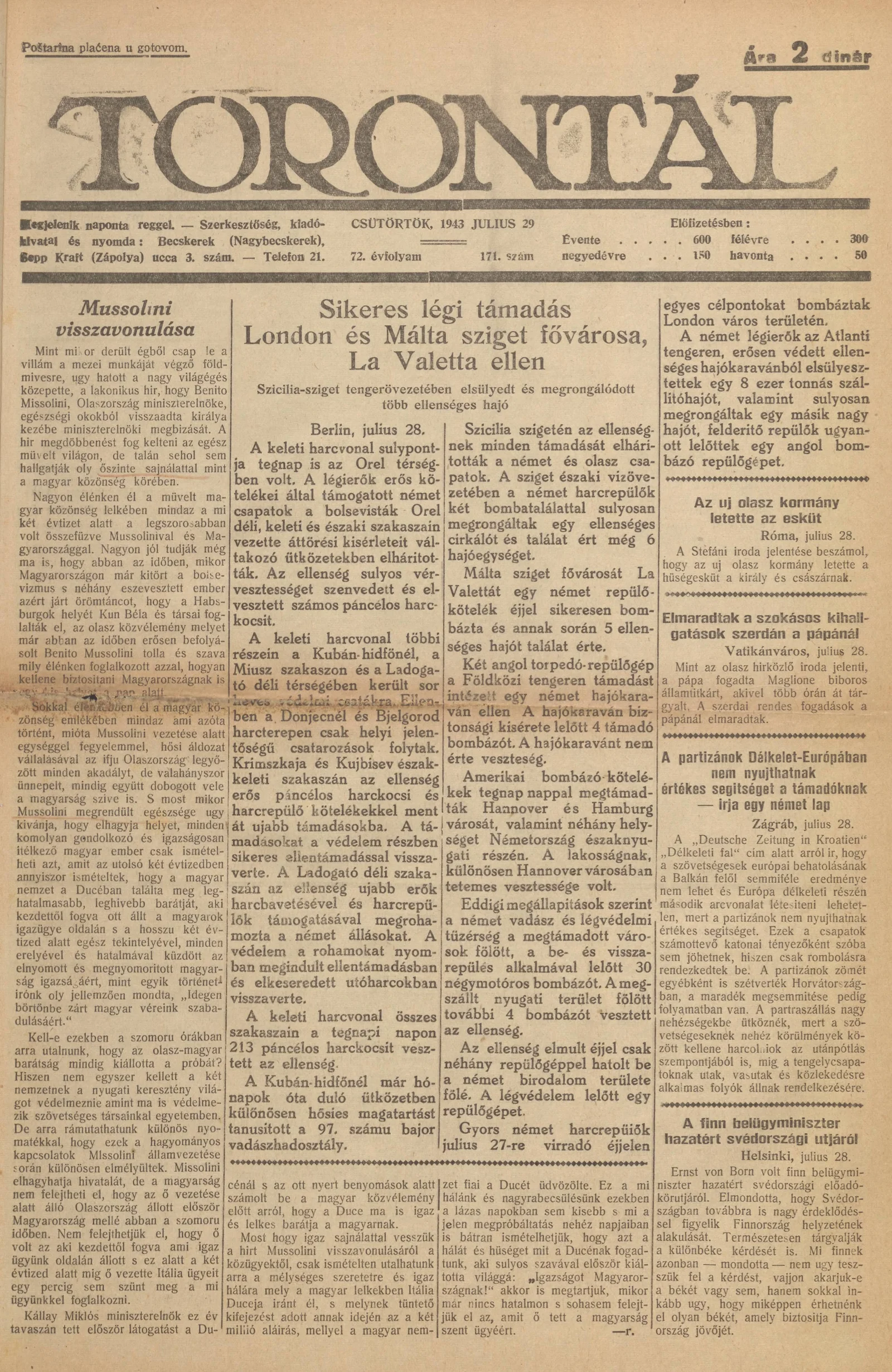 Torontál, 72. évf. 1943. július 29. 171. sz.