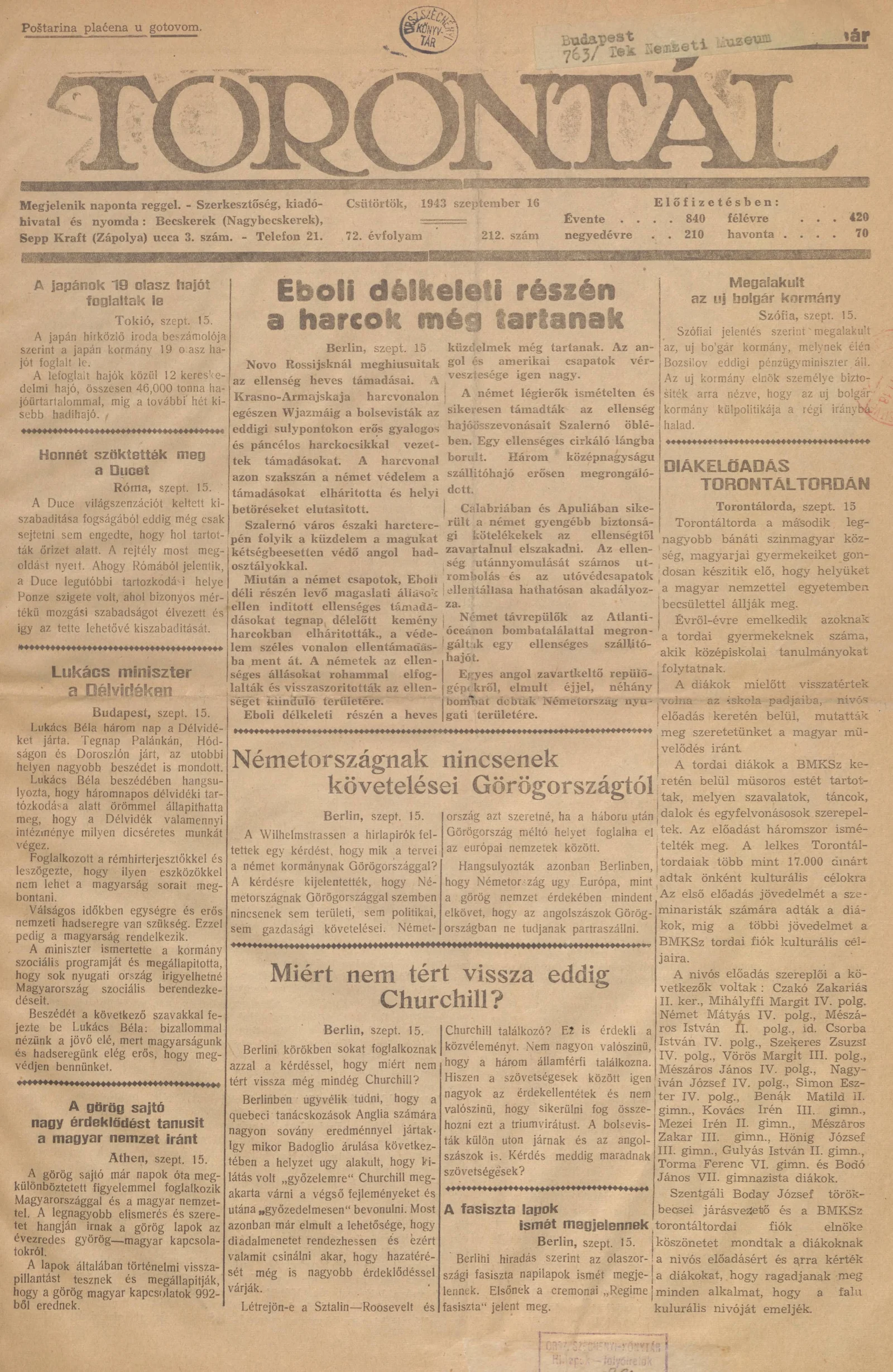 Torontál, 72. évf. 1943. szeptember 16. 212. sz.