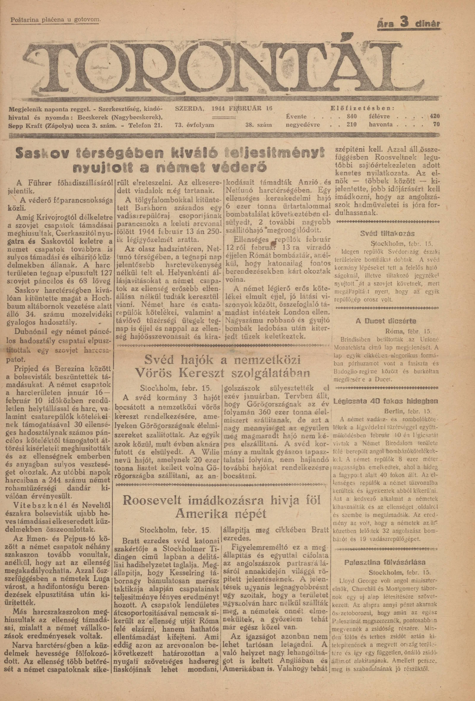 Torontál, 73. évf. 1944. február 16. 38. sz.