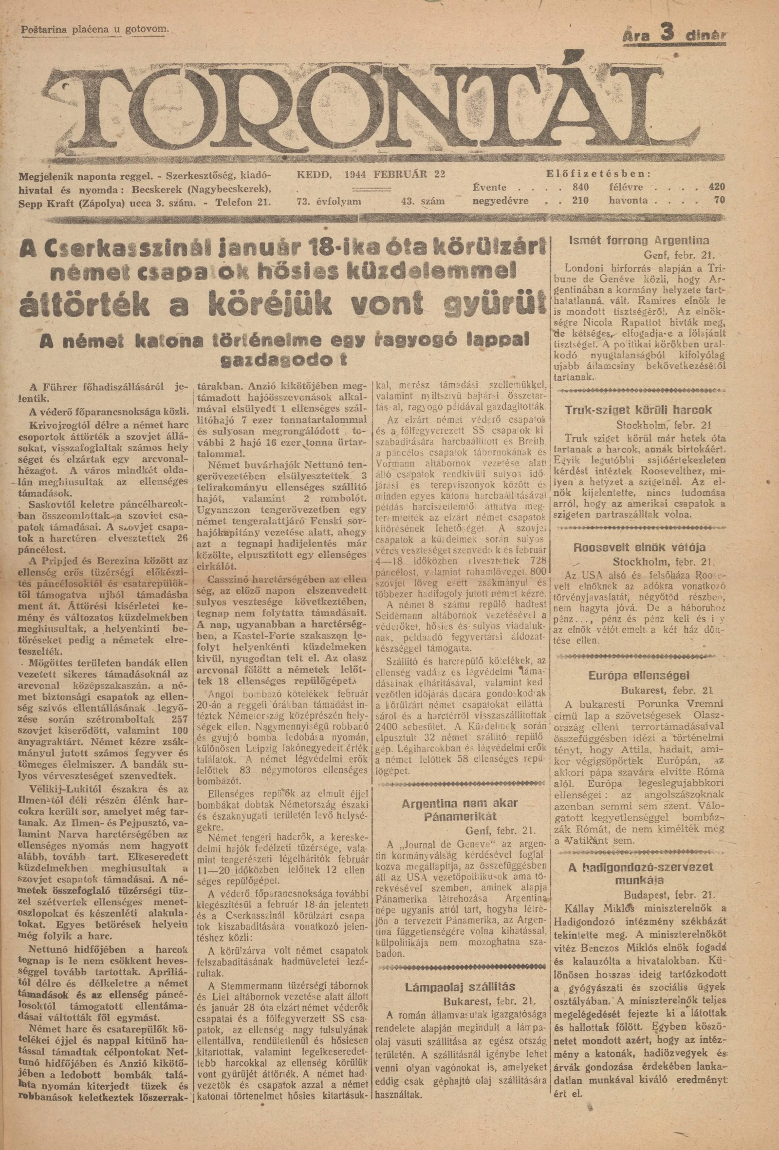 Torontál, 73. évf. 1944. február 22. 43. sz.