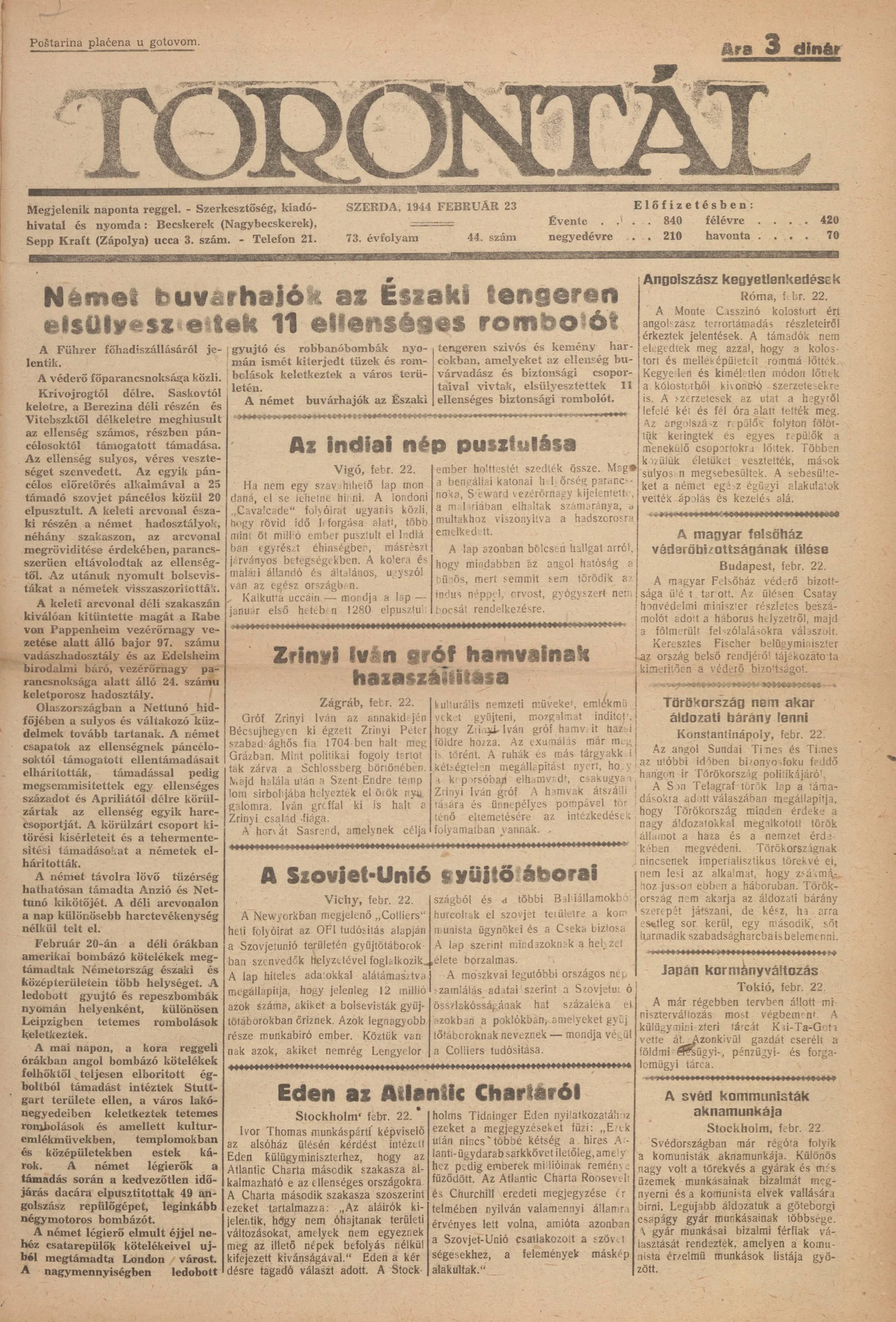 Torontál, 73. évf. 1944. február 23. 44. sz.