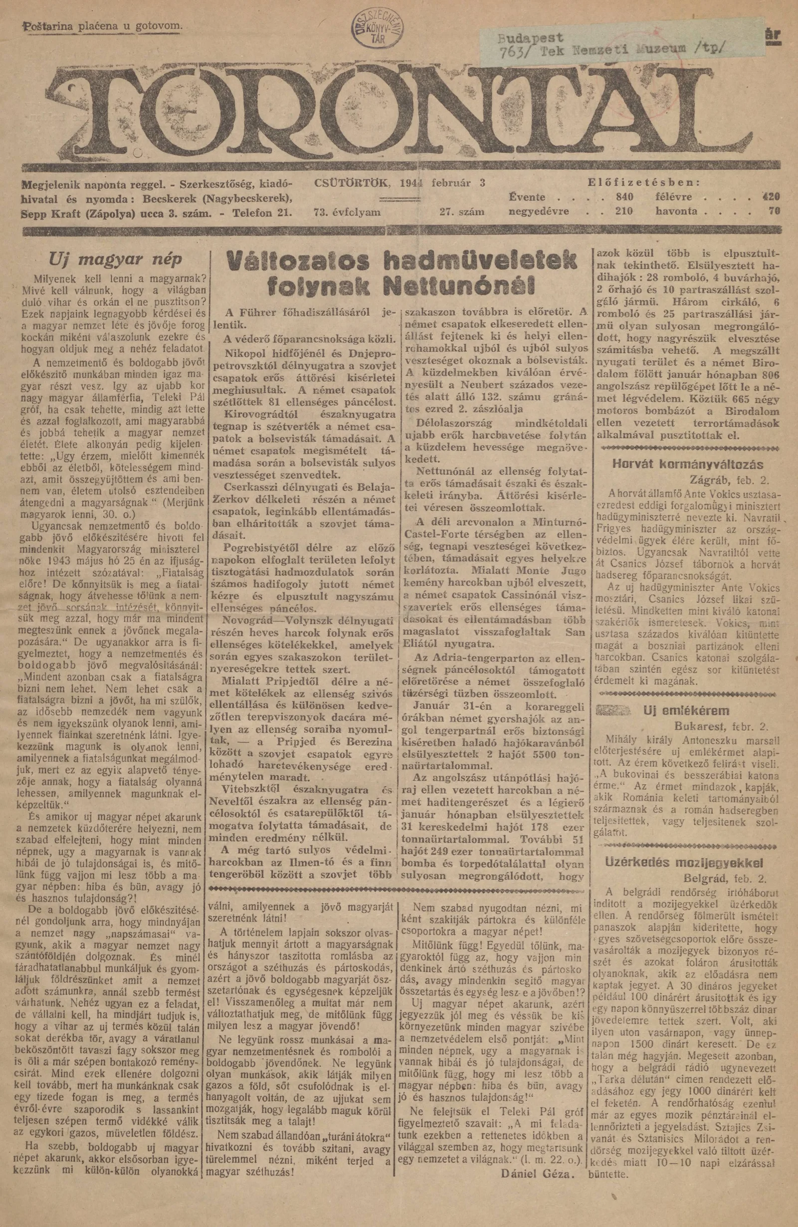 Torontál, 73. évf. 1944. február 3. 27. sz.