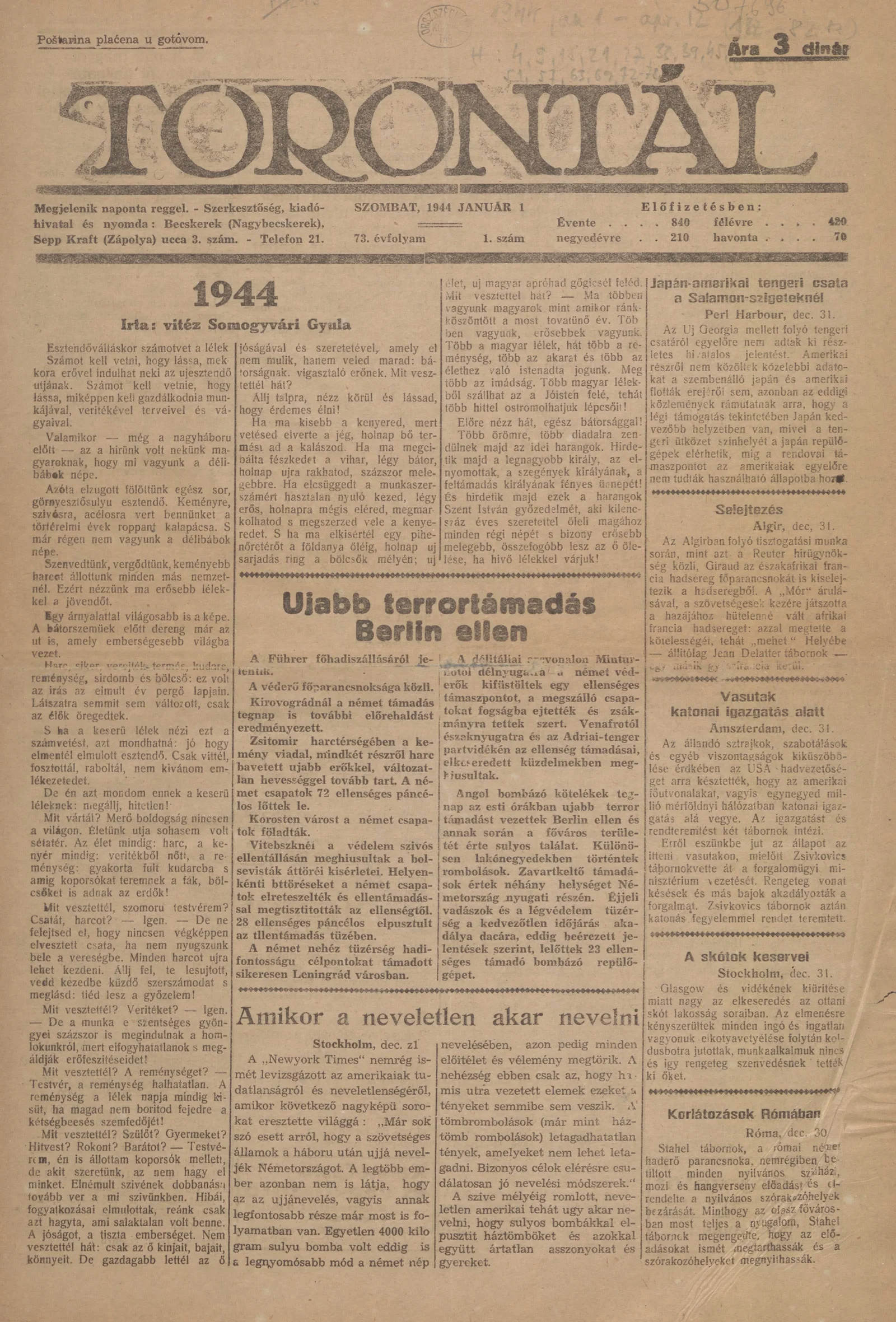 Torontál, 73. évf. 1944. január 1. 1. sz.