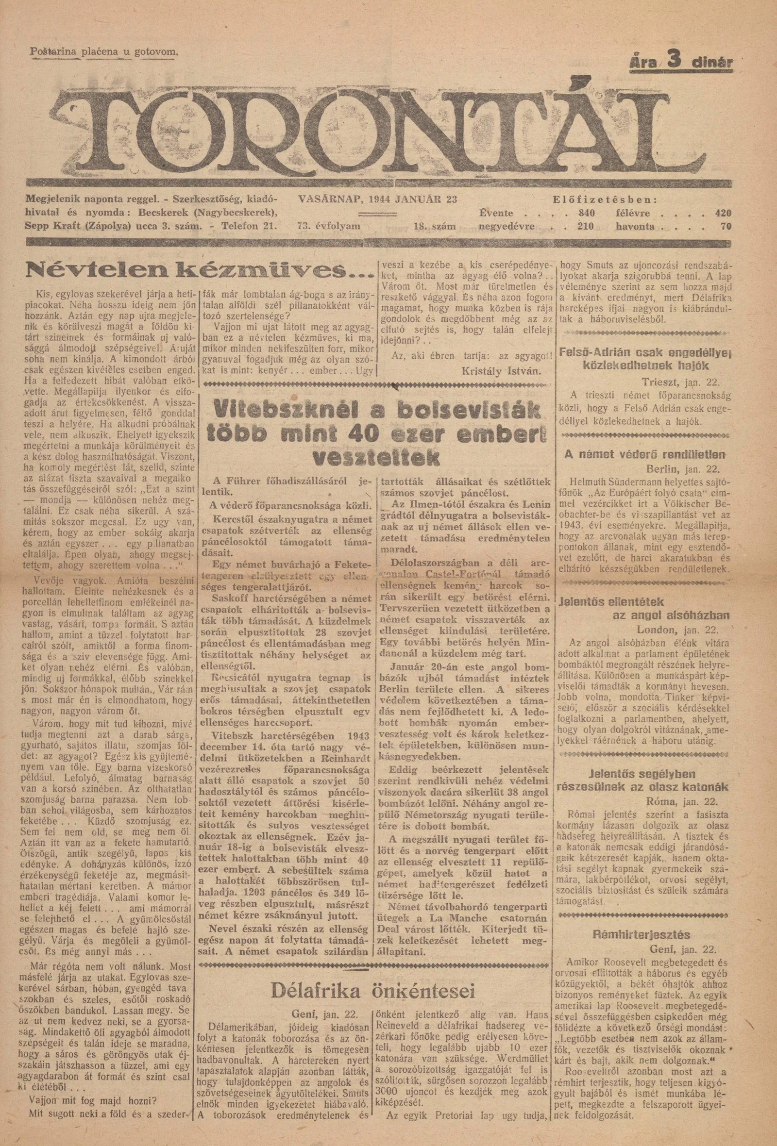 Torontál, 73. évf. 1944. január 23. 18. sz.