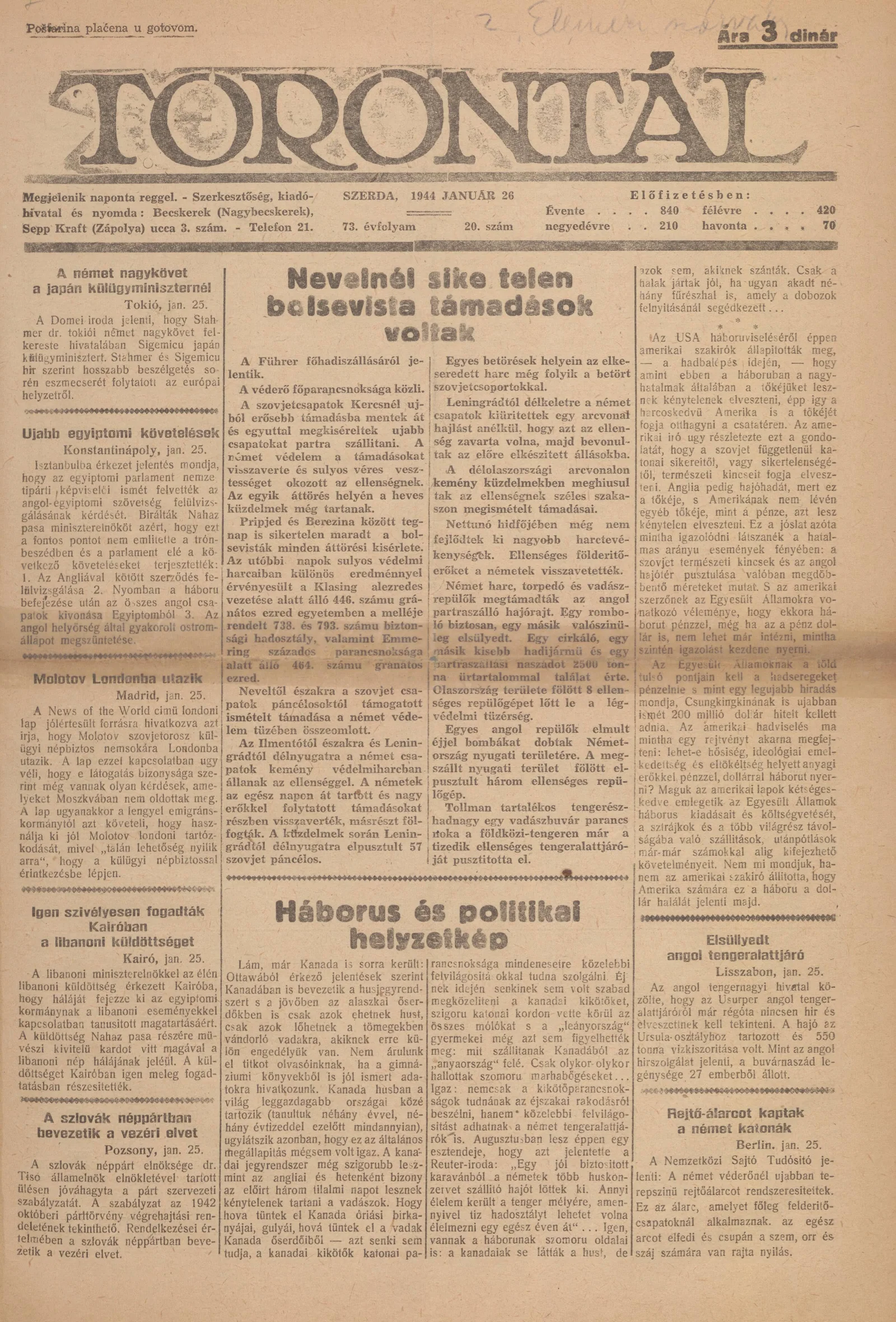 Torontál, 73. évf. 1944. január 26. 20. sz.
