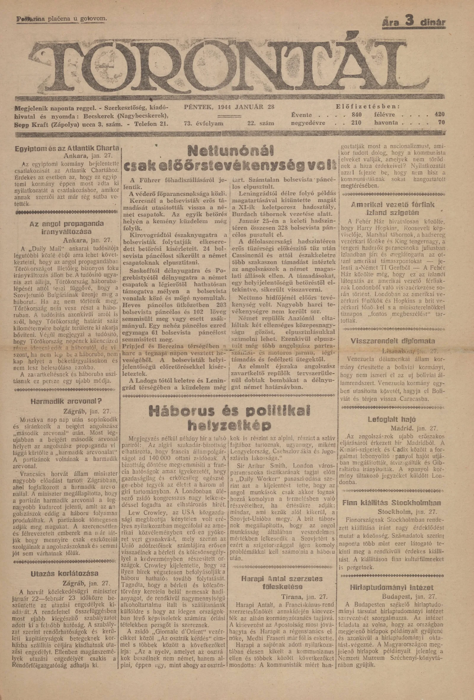 Torontál, 73. évf. 1944. január 28. 22. sz.