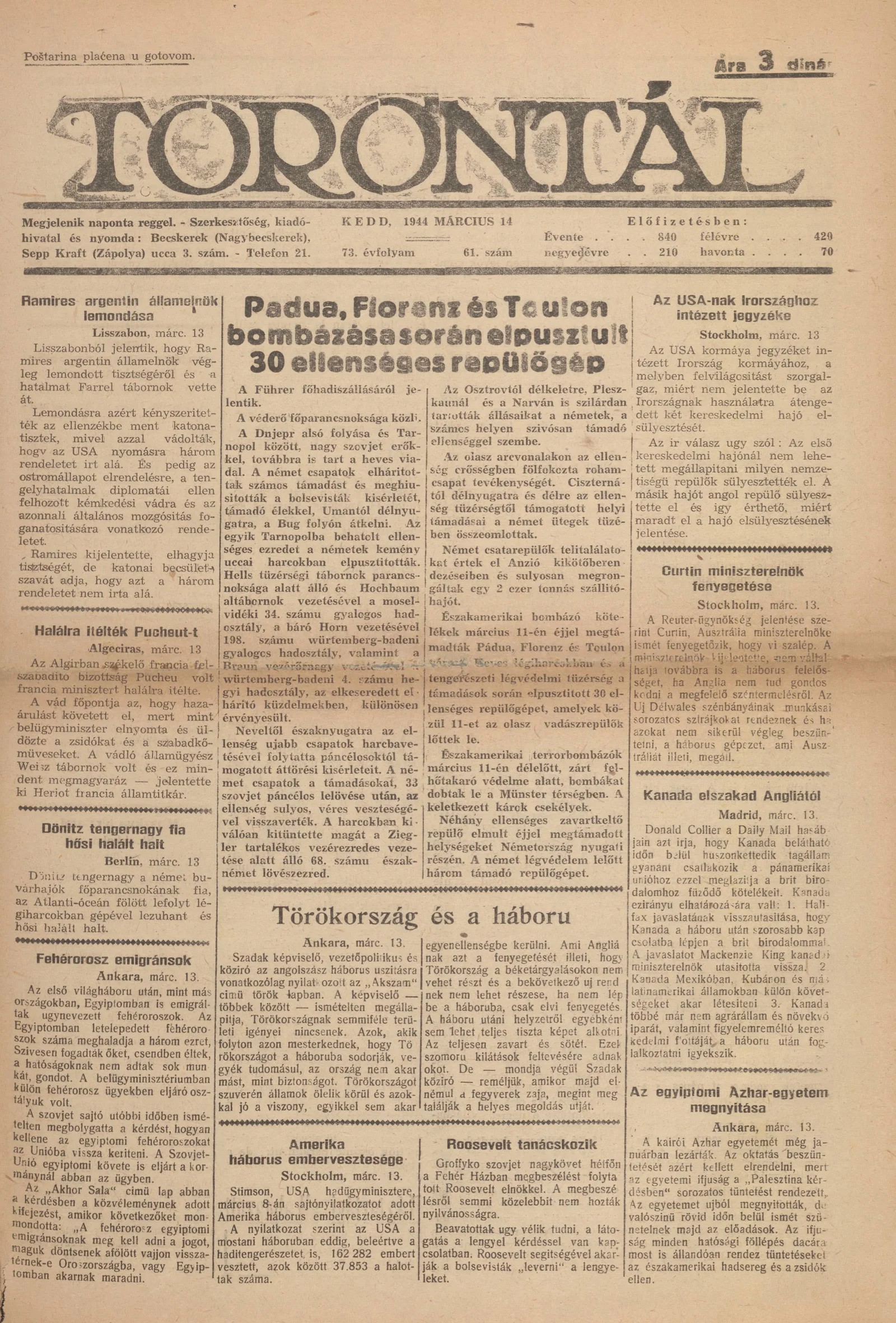 Torontál, 73. évf. 1944. március 14. 61. sz.