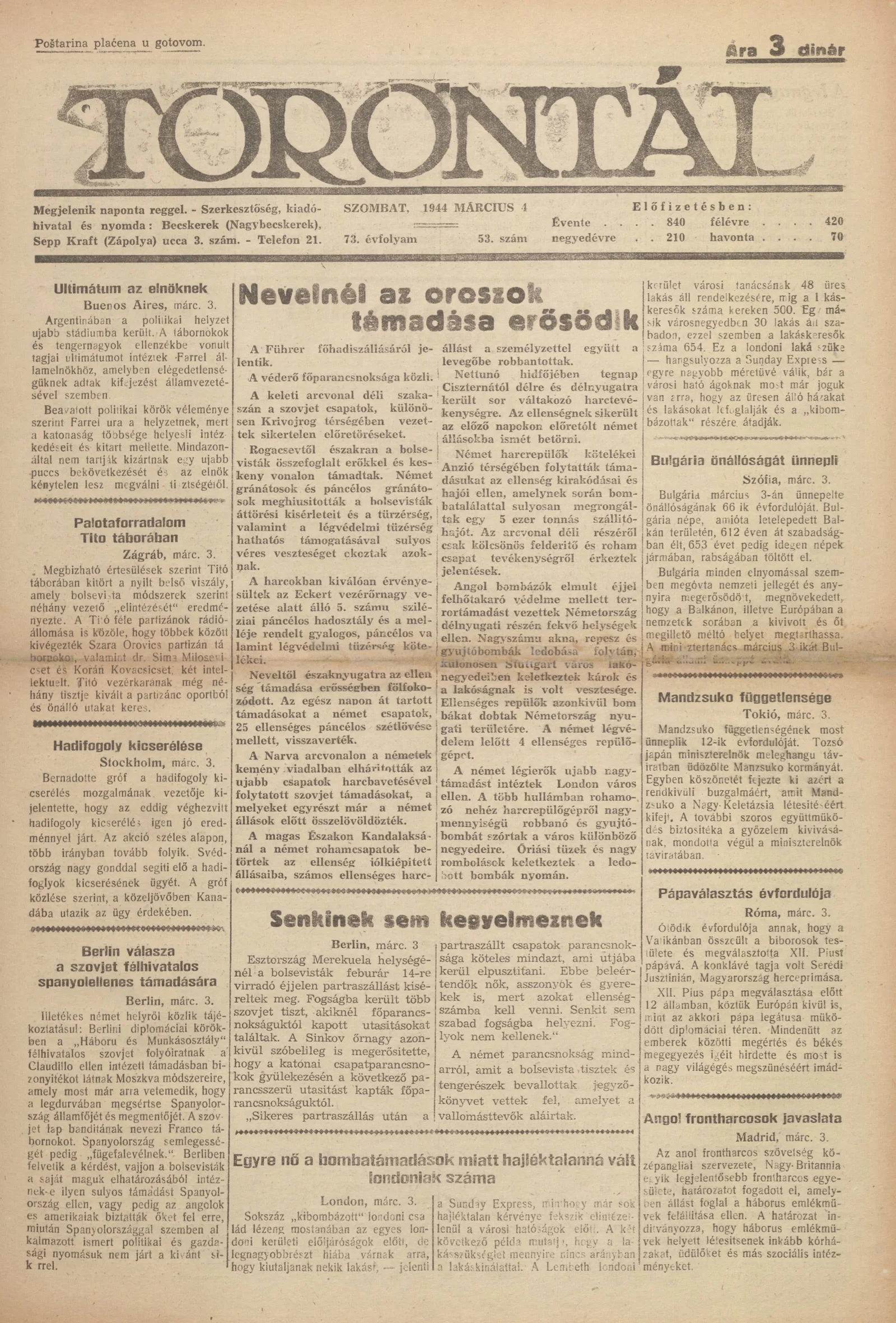 Torontál, 73. évf. 1944. március 4. 53. sz.