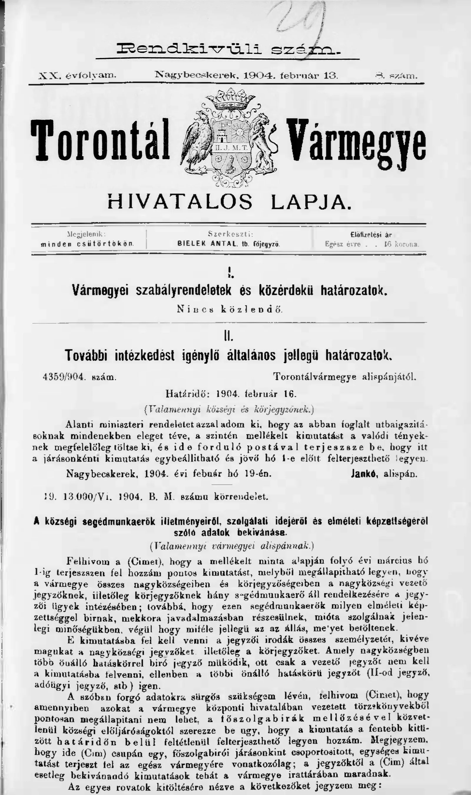 Torontál Vármegye Hivatalos Lapja, 20. évf. 1904. február 13. 8. sz.
