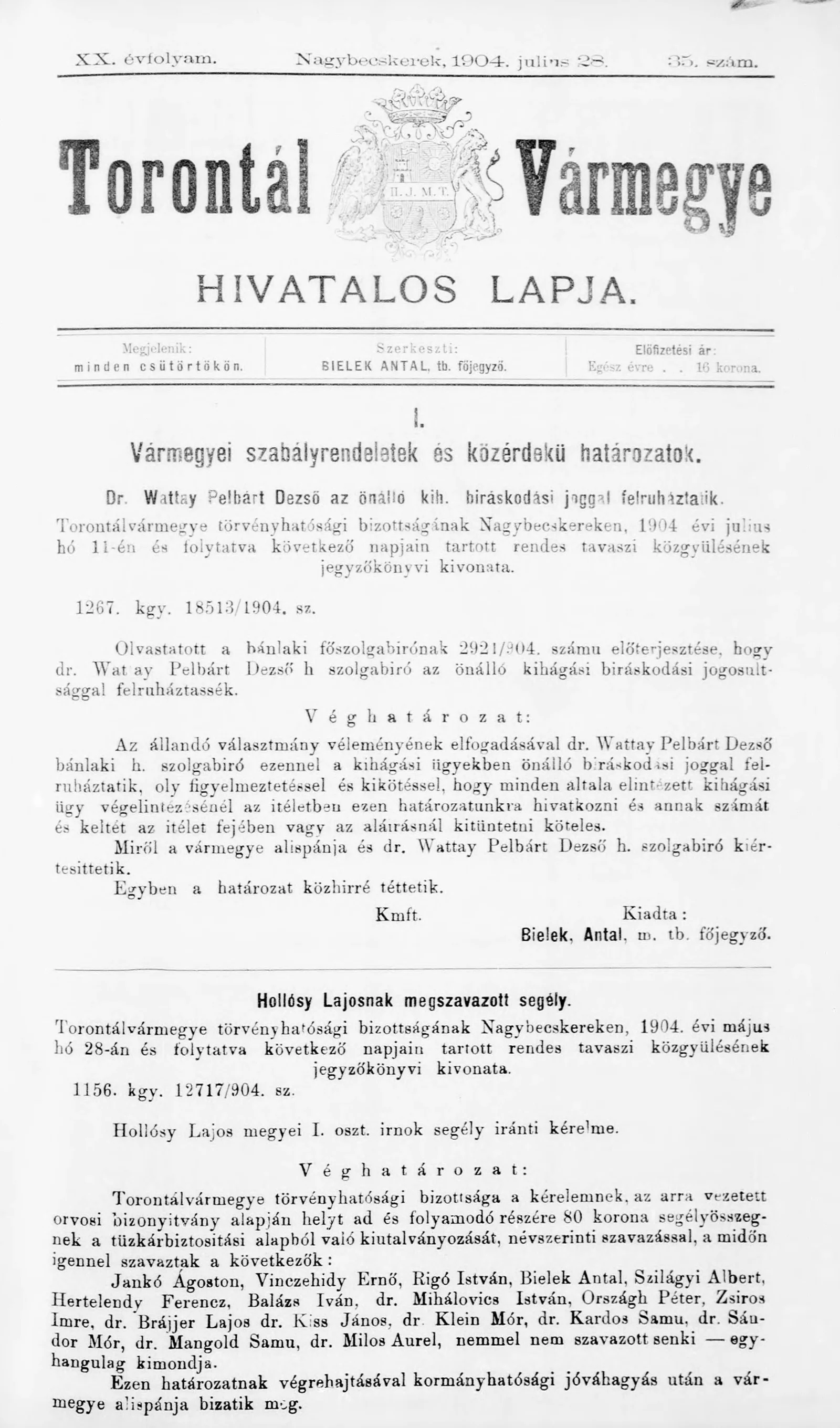Torontál Vármegye Hivatalos Lapja, 20. évf. 1904. július 28. 35. sz.