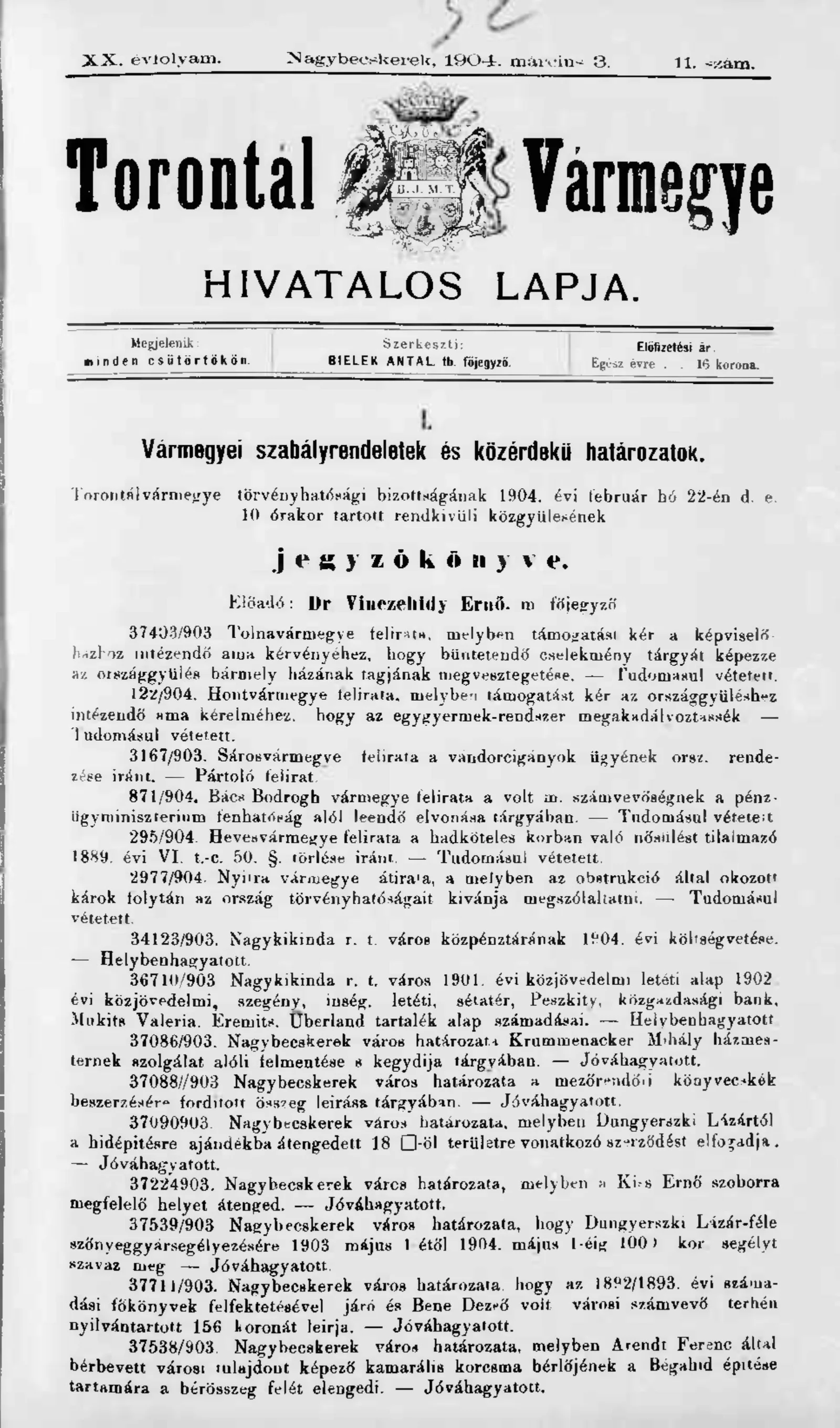 Torontál Vármegye Hivatalos Lapja, 20. évf. 1904. március 3. 11. sz.