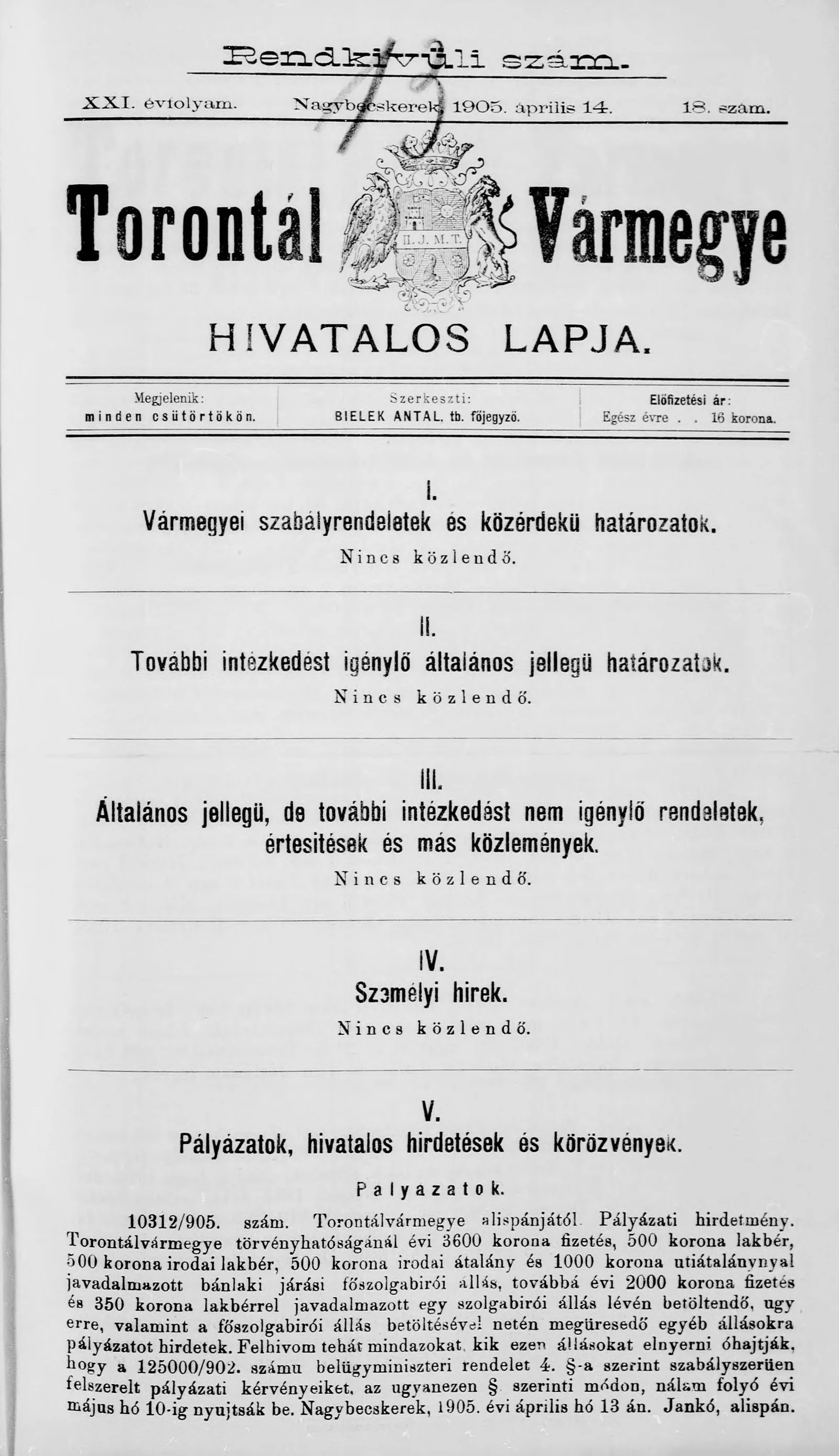 Torontál Vármegye Hivatalos Lapja, 21. évf. 1905. április 14. 18. sz.