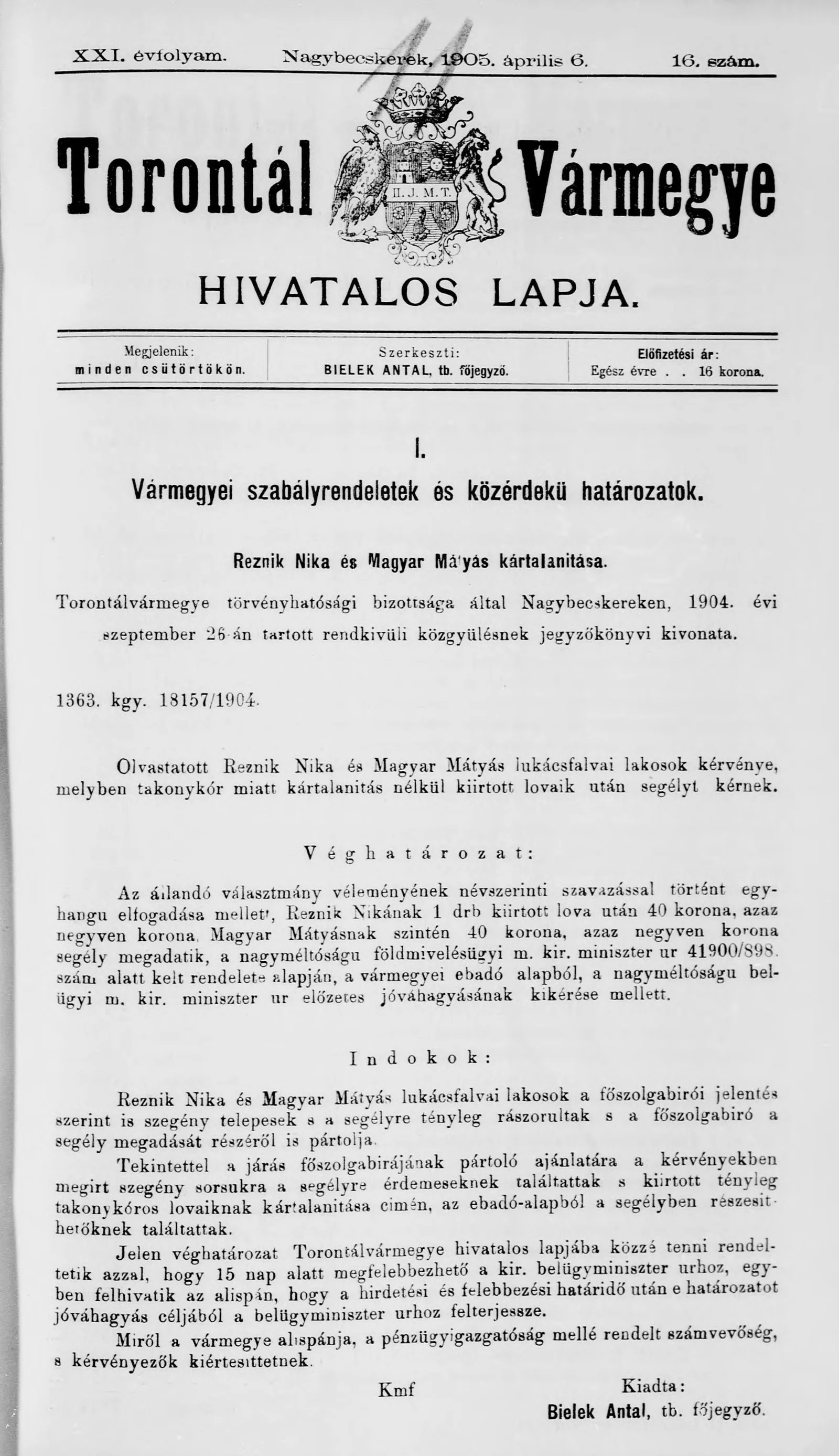 Torontál Vármegye Hivatalos Lapja, 21. évf. 1905. április 6. 16. sz.