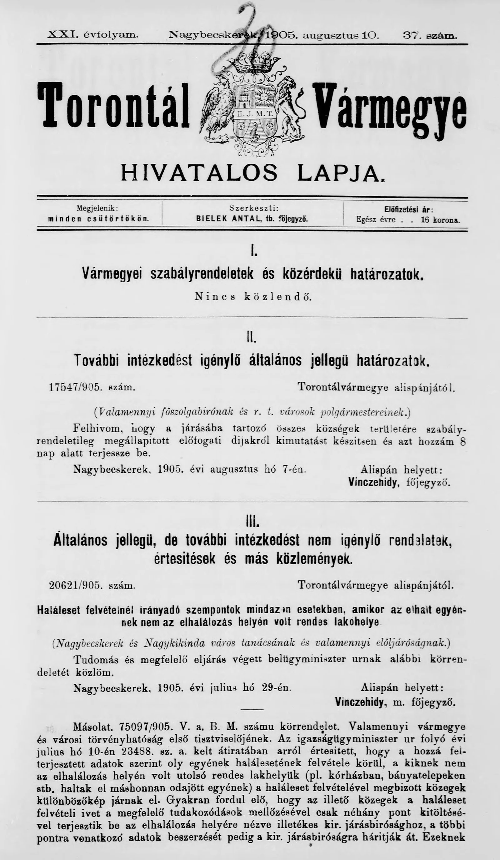 Torontál Vármegye Hivatalos Lapja, 21. évf. 1905. augusztus 10. 37. sz.