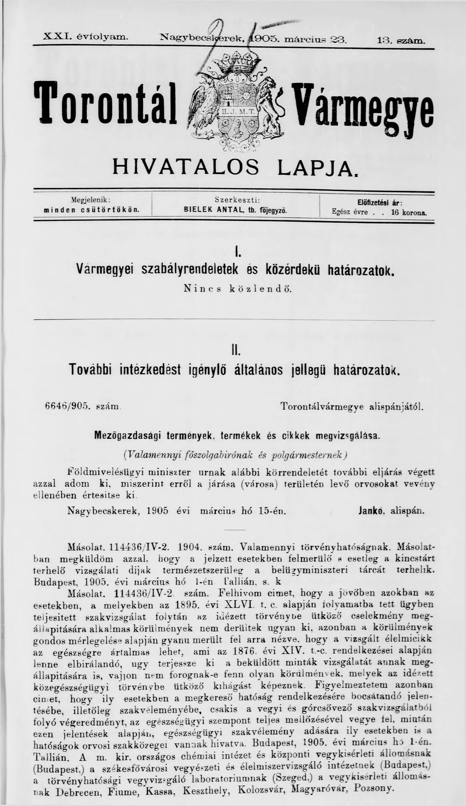 Torontál Vármegye Hivatalos Lapja, 21. évf. 1905. március 23. 13. sz.