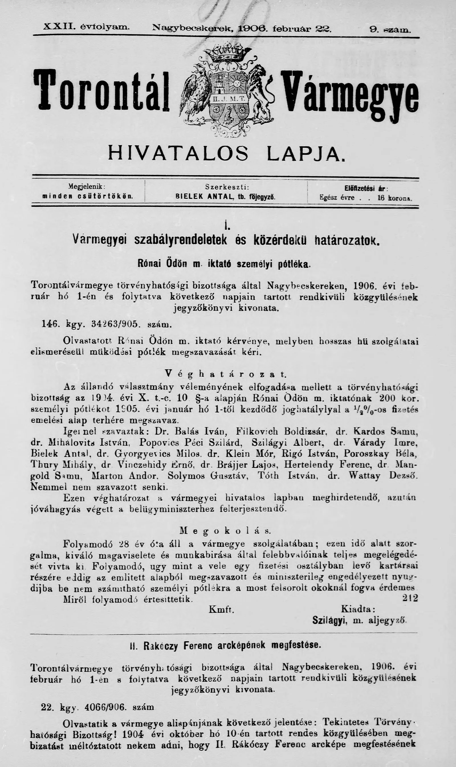 Torontál Vármegye Hivatalos Lapja, 22. évf. 1906. február 22. 9. sz.