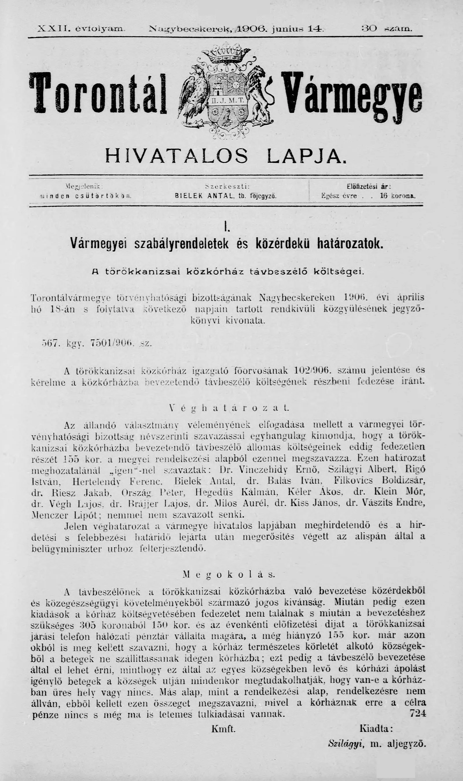 Torontál Vármegye Hivatalos Lapja, 22. évf. 1906. június 14. 30. sz.
