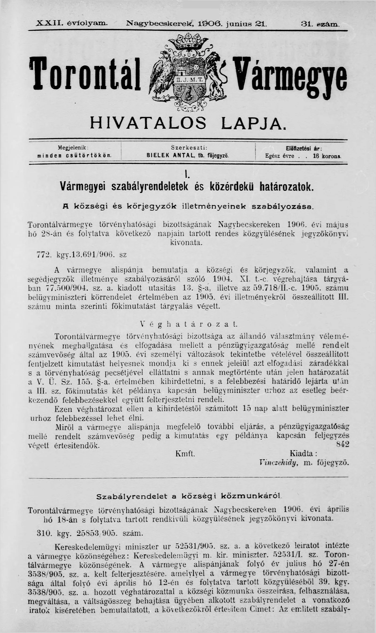 Torontál Vármegye Hivatalos Lapja, 22. évf. 1906. június 21. 31. sz.