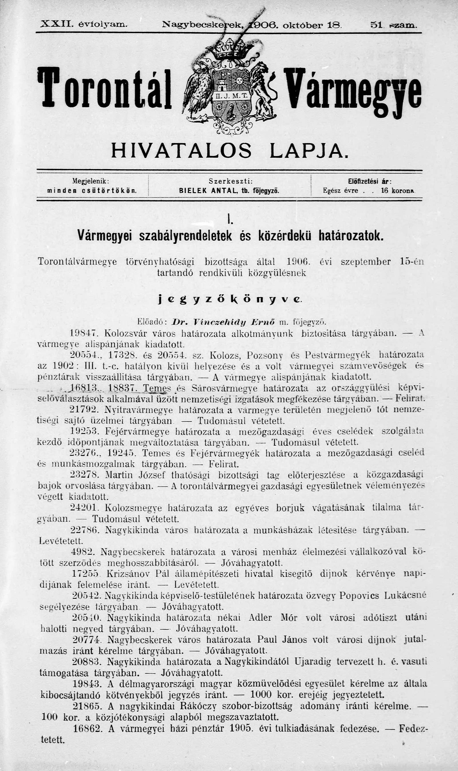 Torontál Vármegye Hivatalos Lapja, 22. évf. 1906. október 18. 51. sz.