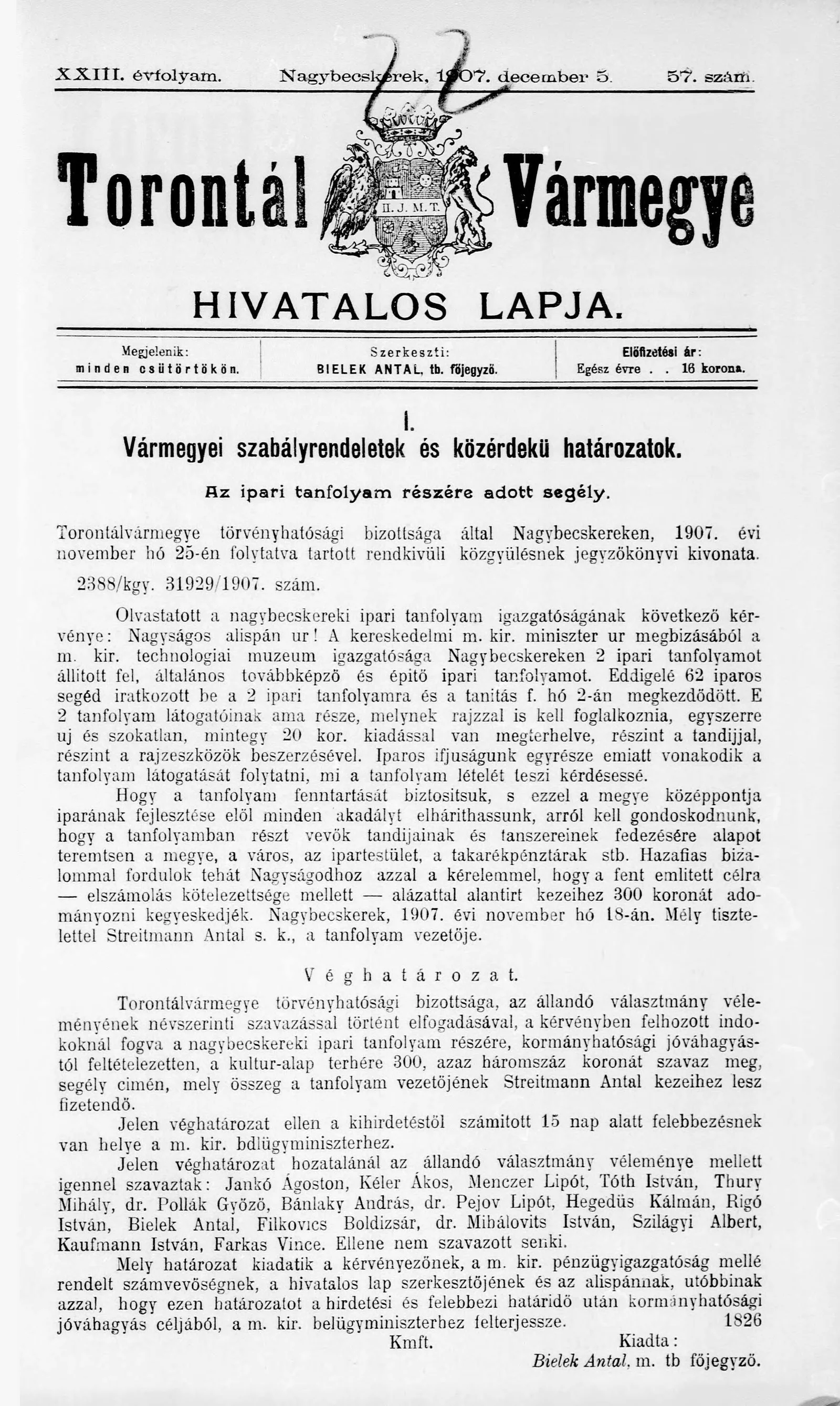 Torontál Vármegye Hivatalos Lapja, 23. évf. 1907. december 5. 57. sz.