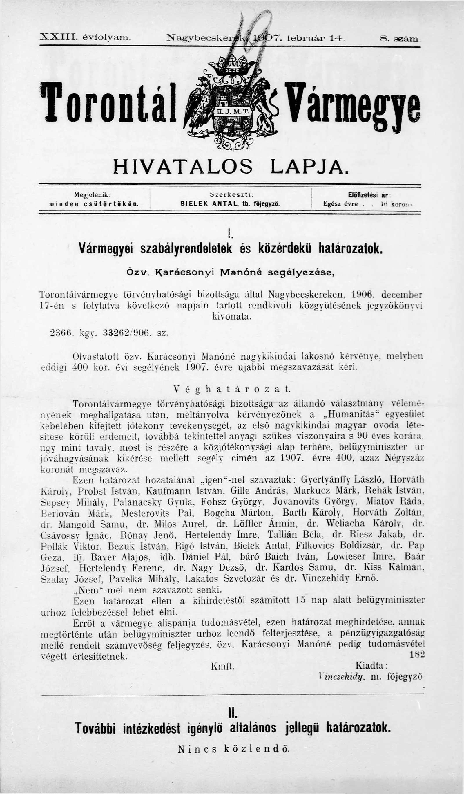 Torontál Vármegye Hivatalos Lapja, 23. évf. 1907. február 14. 8. sz.