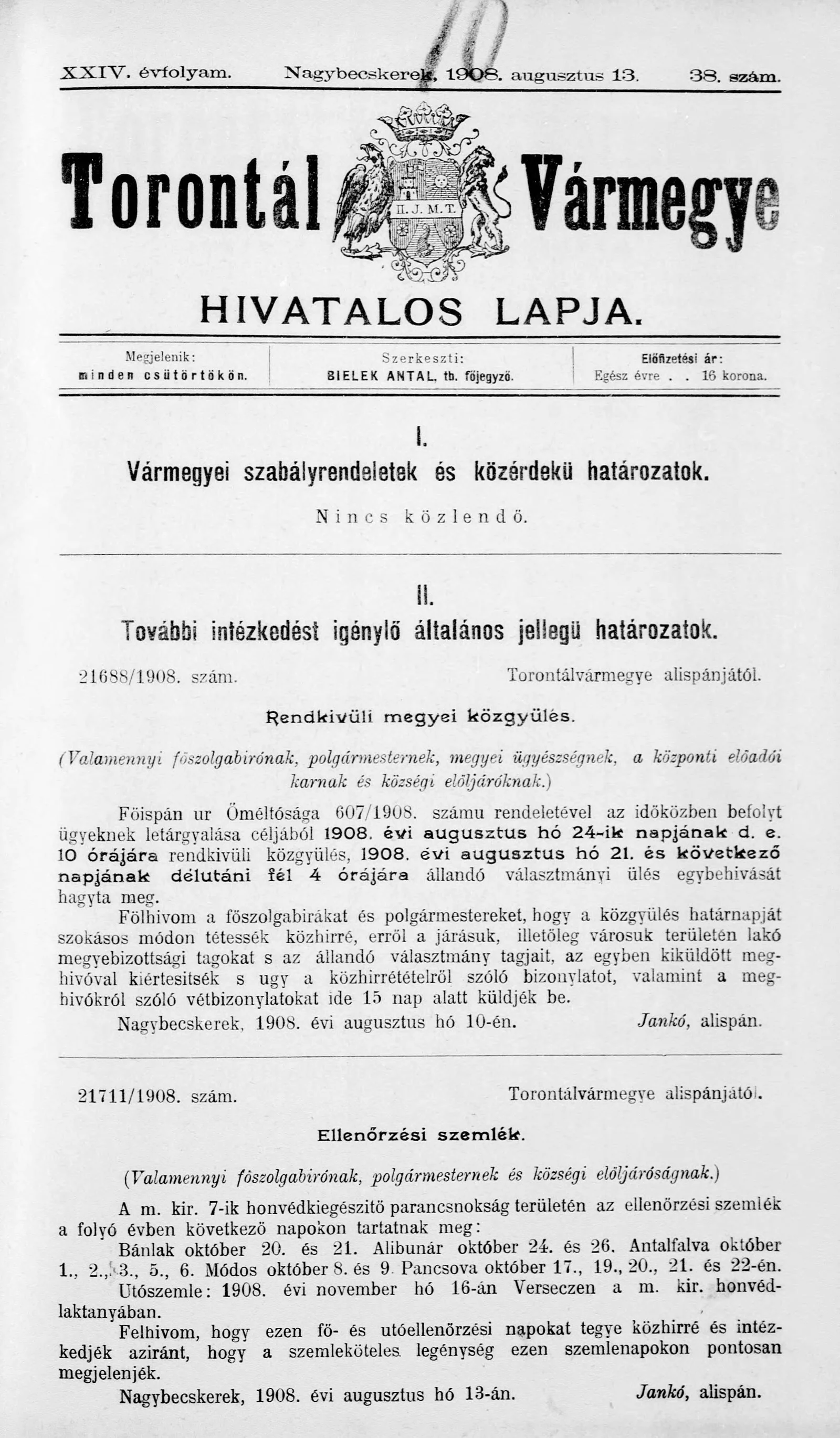 Torontál Vármegye Hivatalos Lapja, 24. évf. 1908. augusztus 13. 38. sz.