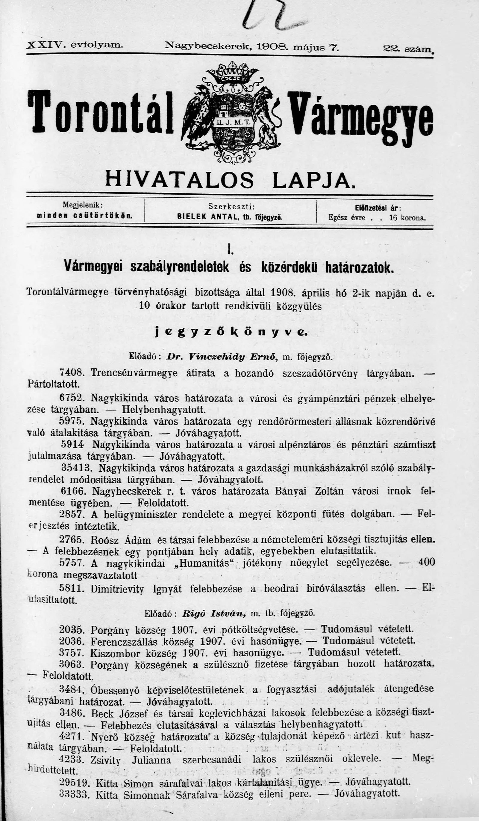 Torontál Vármegye Hivatalos Lapja, 24. évf. 1908. május 7. 22. sz.