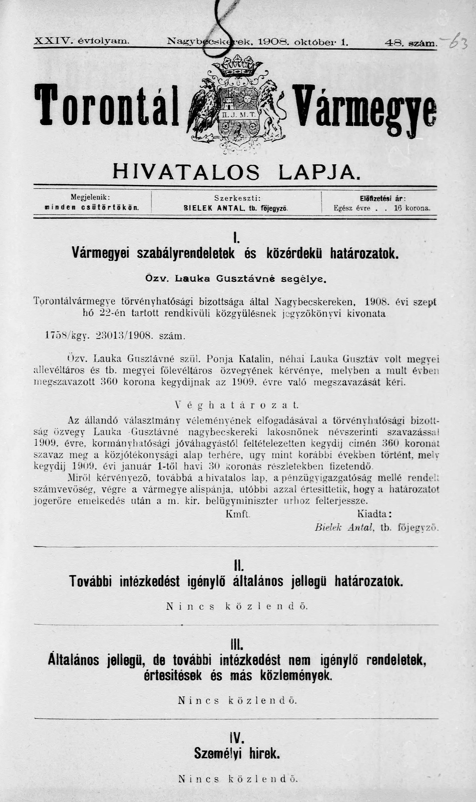 Torontál Vármegye Hivatalos Lapja, 24. évf. 1908. október 1. 48. sz.