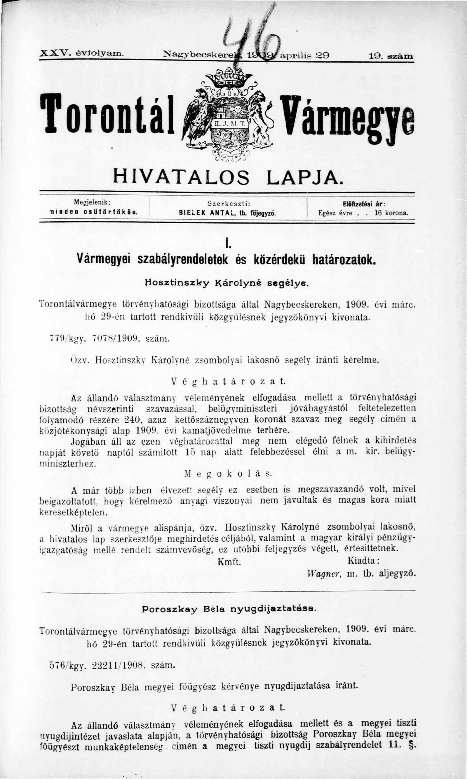 Torontál Vármegye Hivatalos Lapja, 25. évf. 1909. április 29. 19. sz.