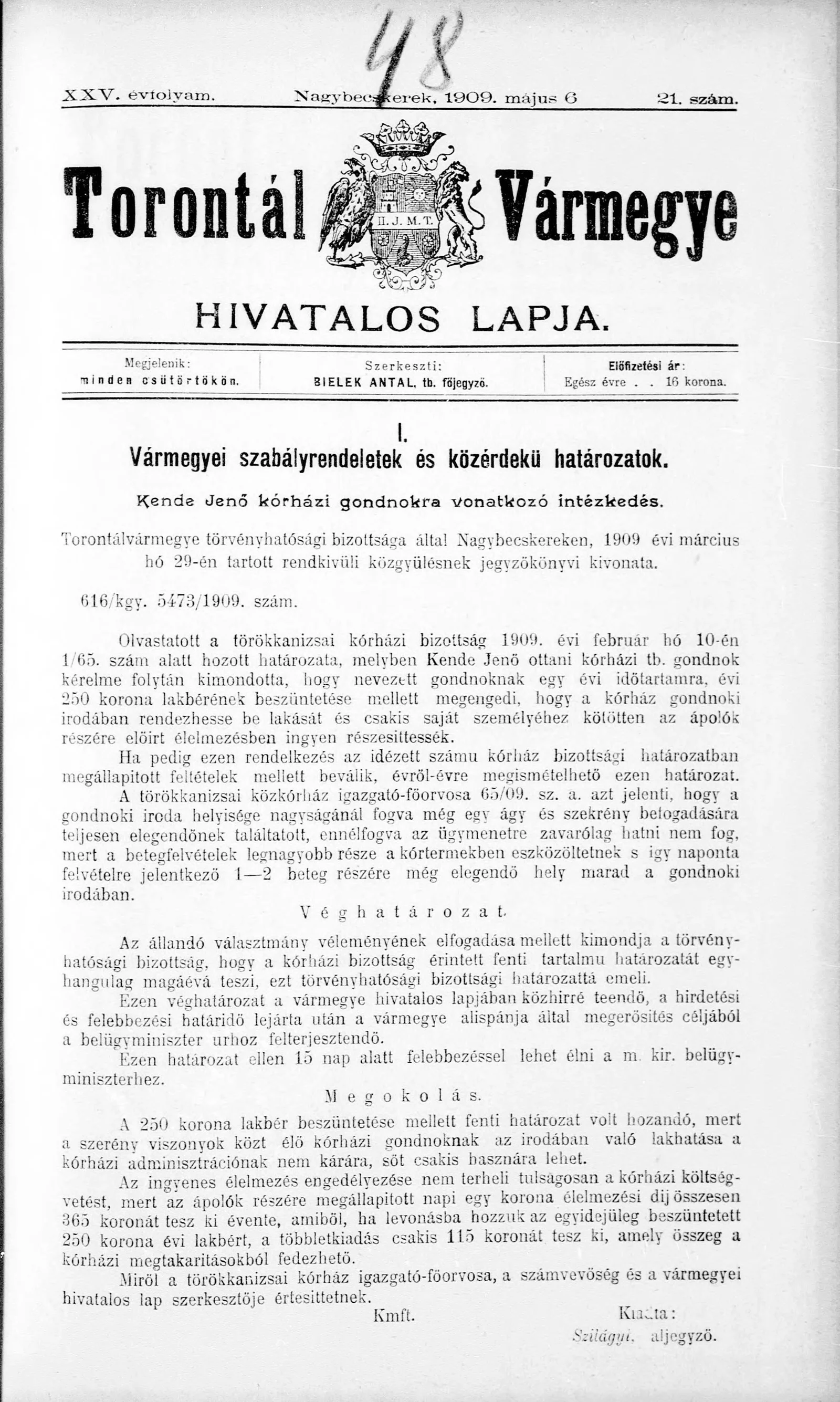 Torontál Vármegye Hivatalos Lapja, 25. évf. 1909. május 6. 21. sz.
