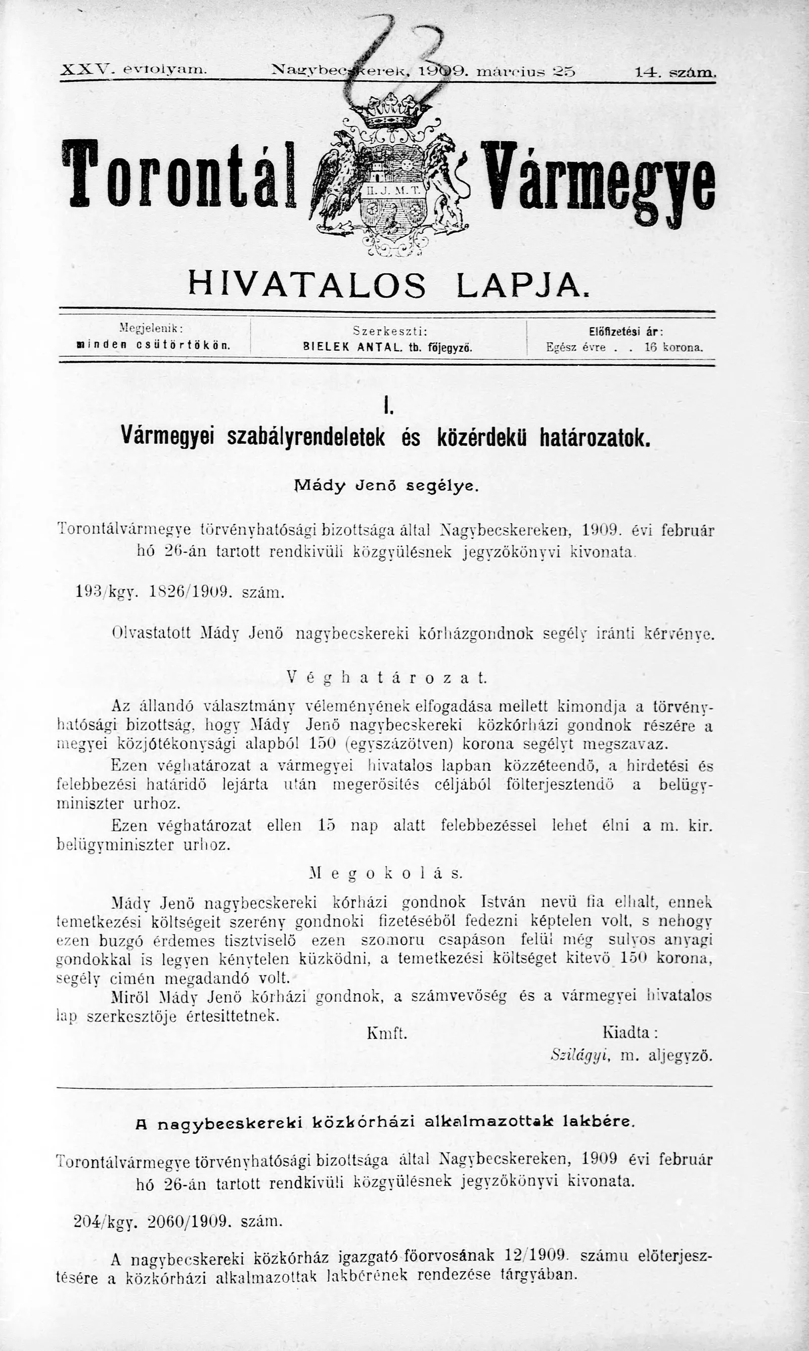 Torontál Vármegye Hivatalos Lapja, 25. évf. 1909. március 25. 14. sz.