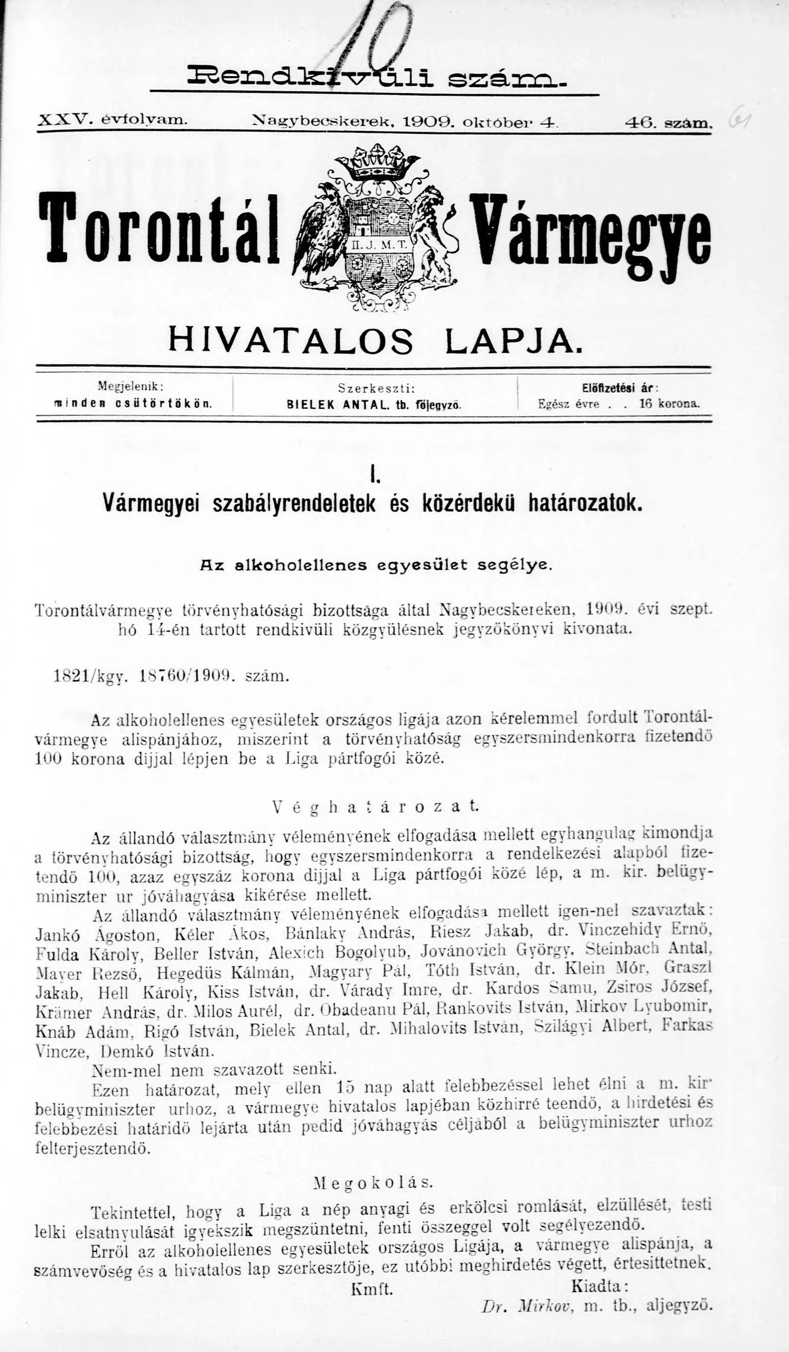 Torontál Vármegye Hivatalos Lapja, 25. évf. 1909. október 4. 46. sz.