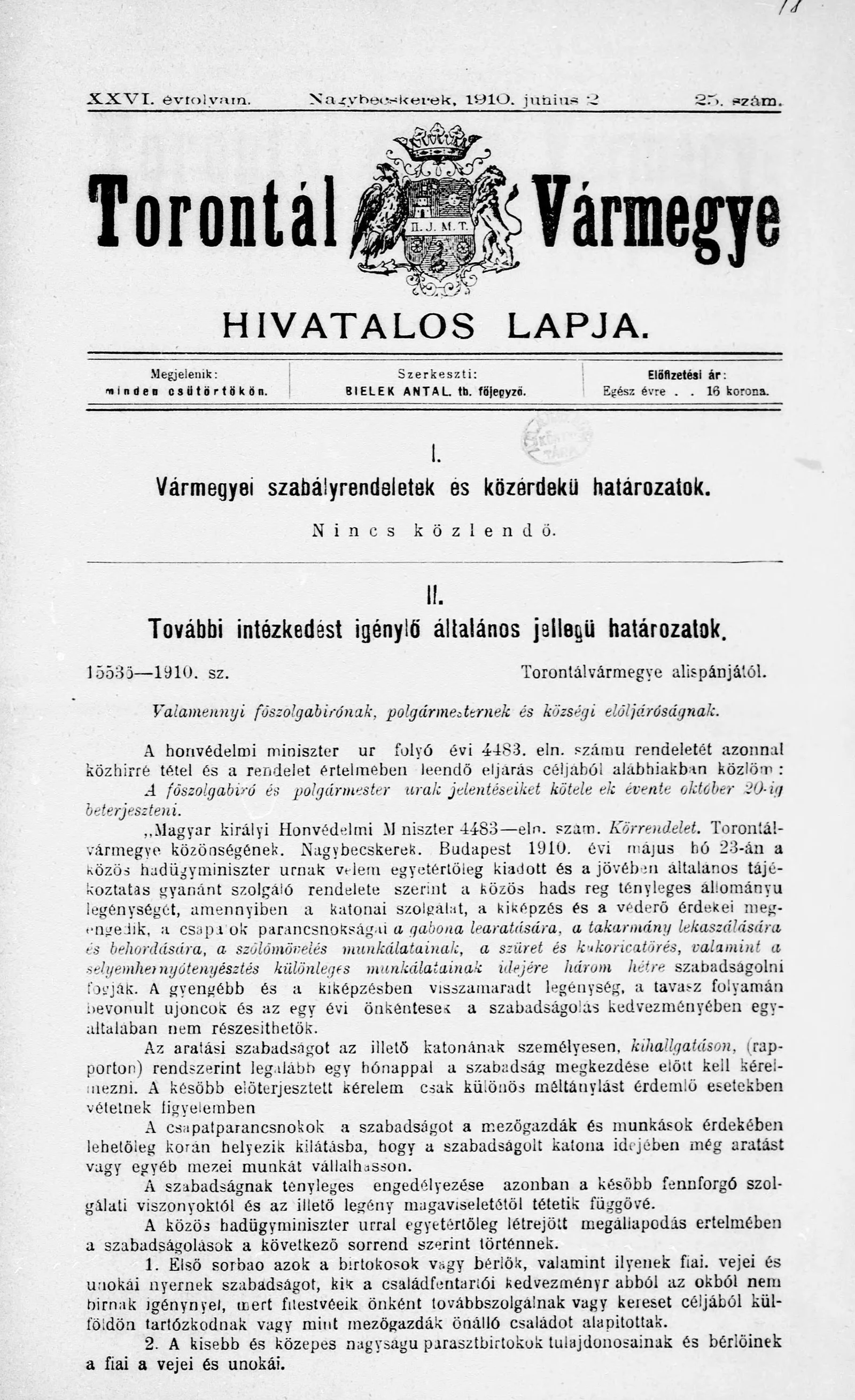 Torontál Vármegye Hivatalos Lapja, 26. évf. 1910. június 2. 25. sz.