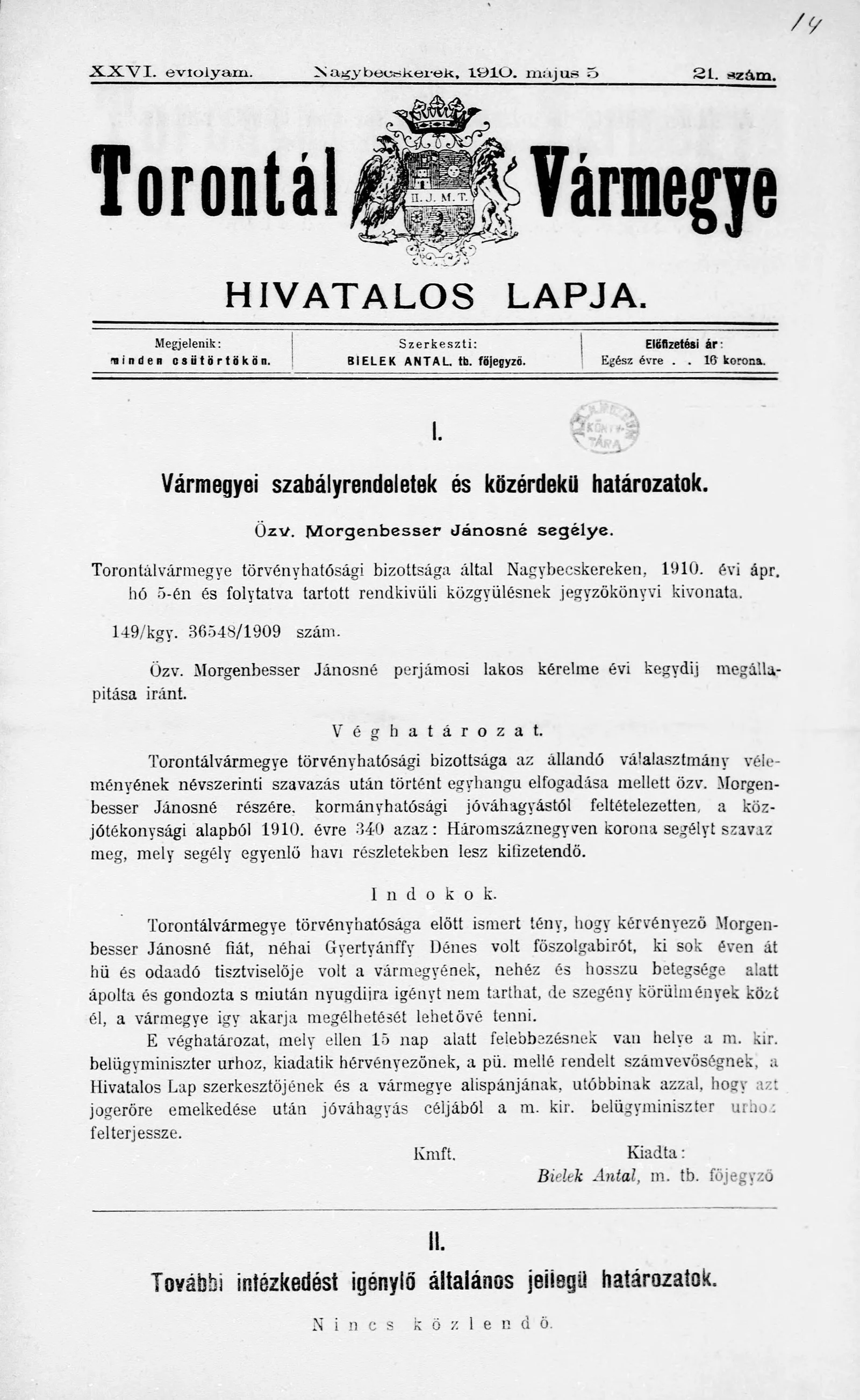 Torontál Vármegye Hivatalos Lapja, 26. évf. 1910. május 5. 21. sz.