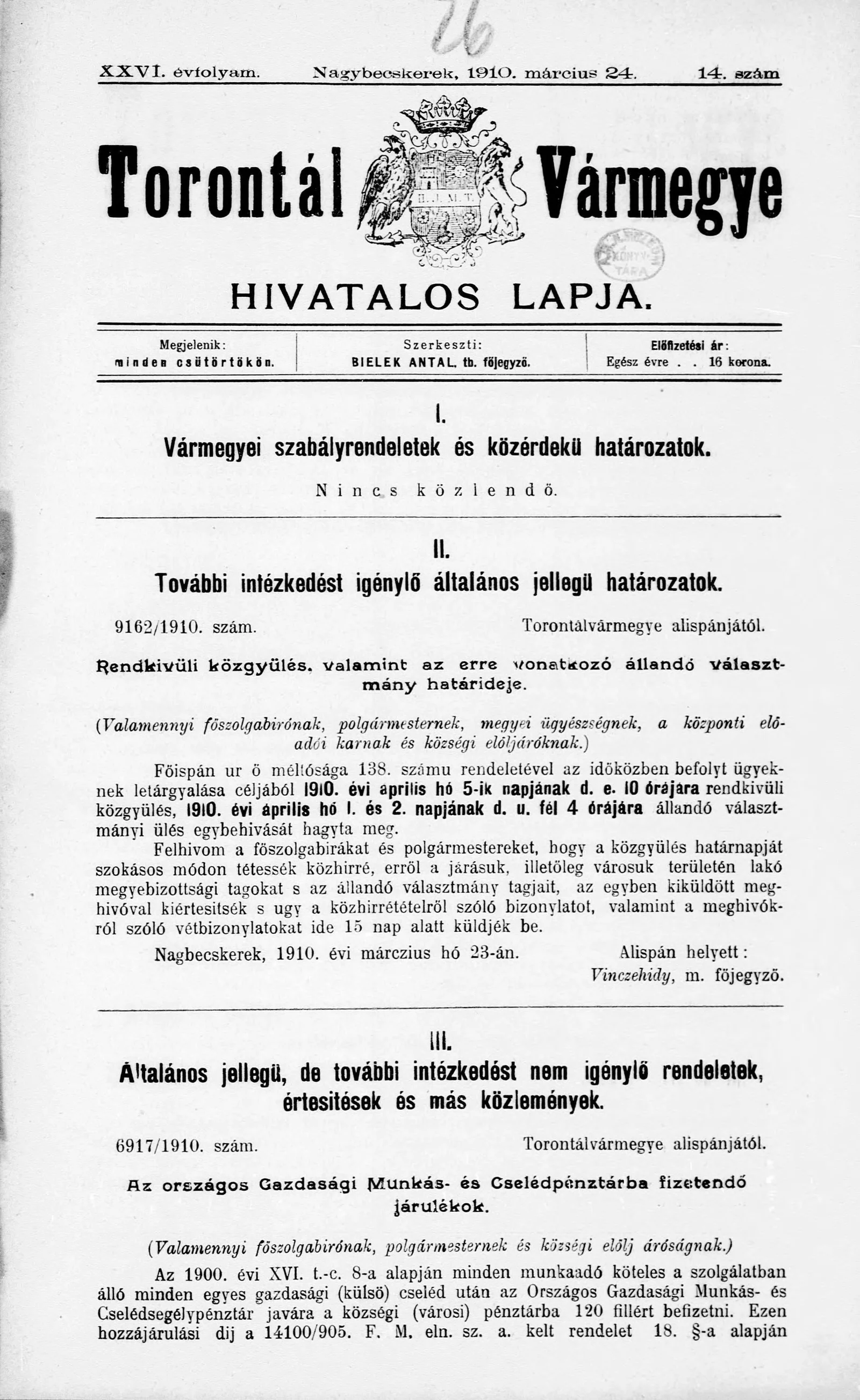 Torontál Vármegye Hivatalos Lapja, 26. évf. 1910. március 24. 14. sz.