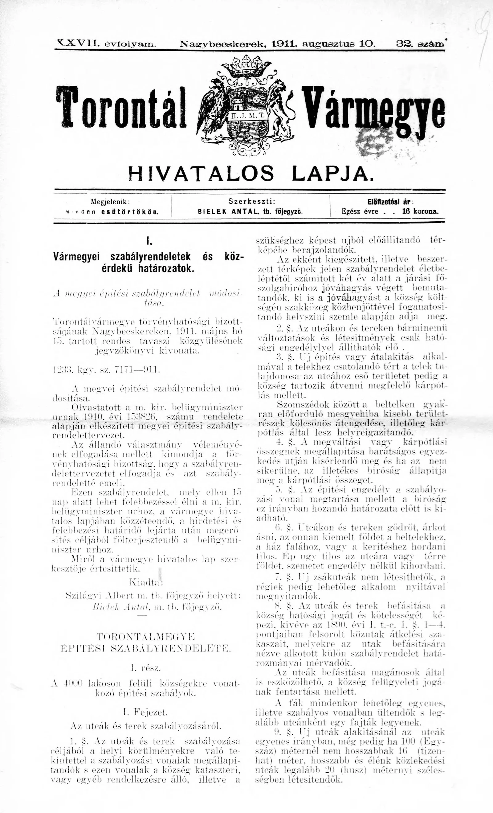 Torontál Vármegye Hivatalos Lapja, 27. évf. 1911. augusztus 10. 32. sz.