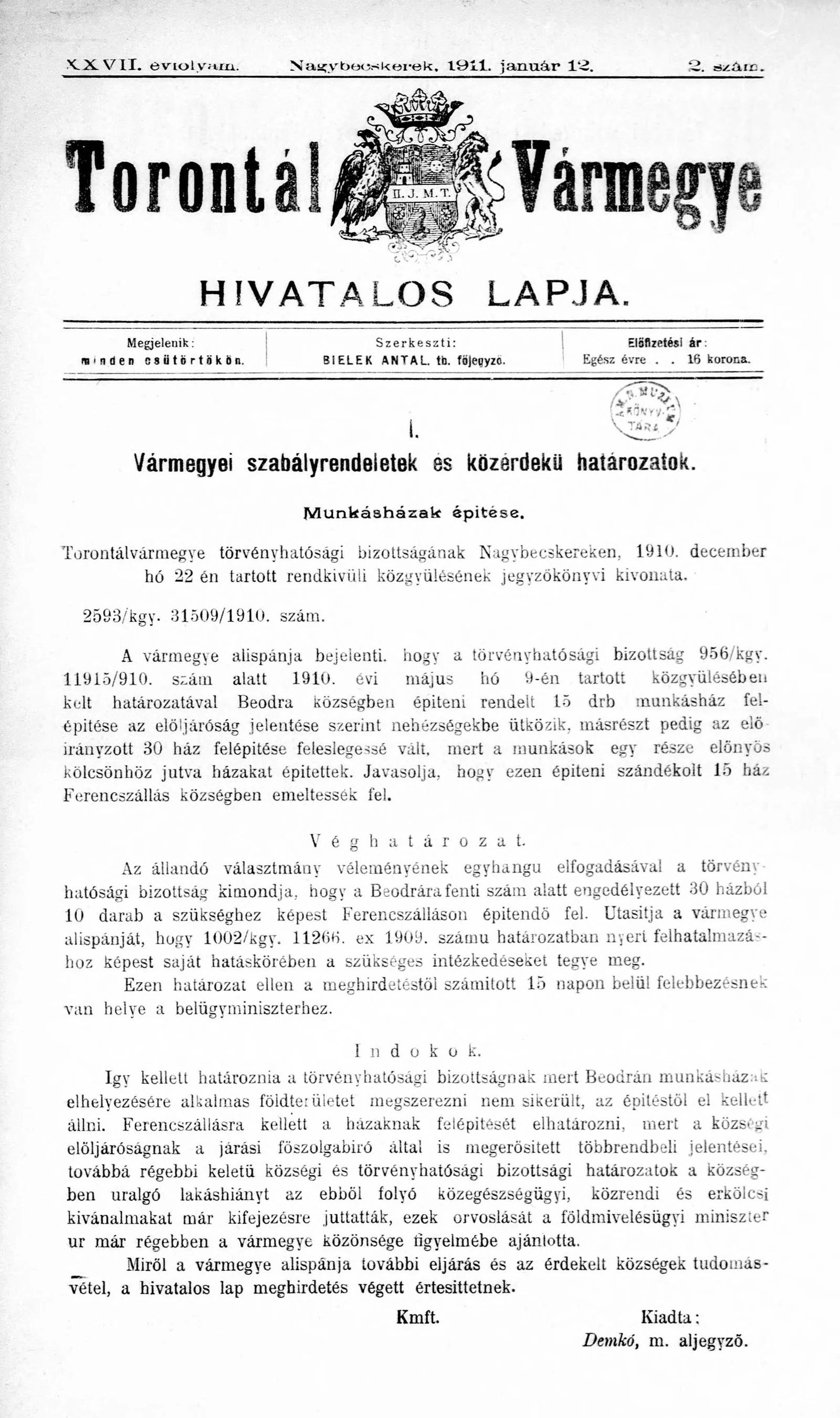 Torontál Vármegye Hivatalos Lapja, 27. évf. 1911. január 12. 2. sz.