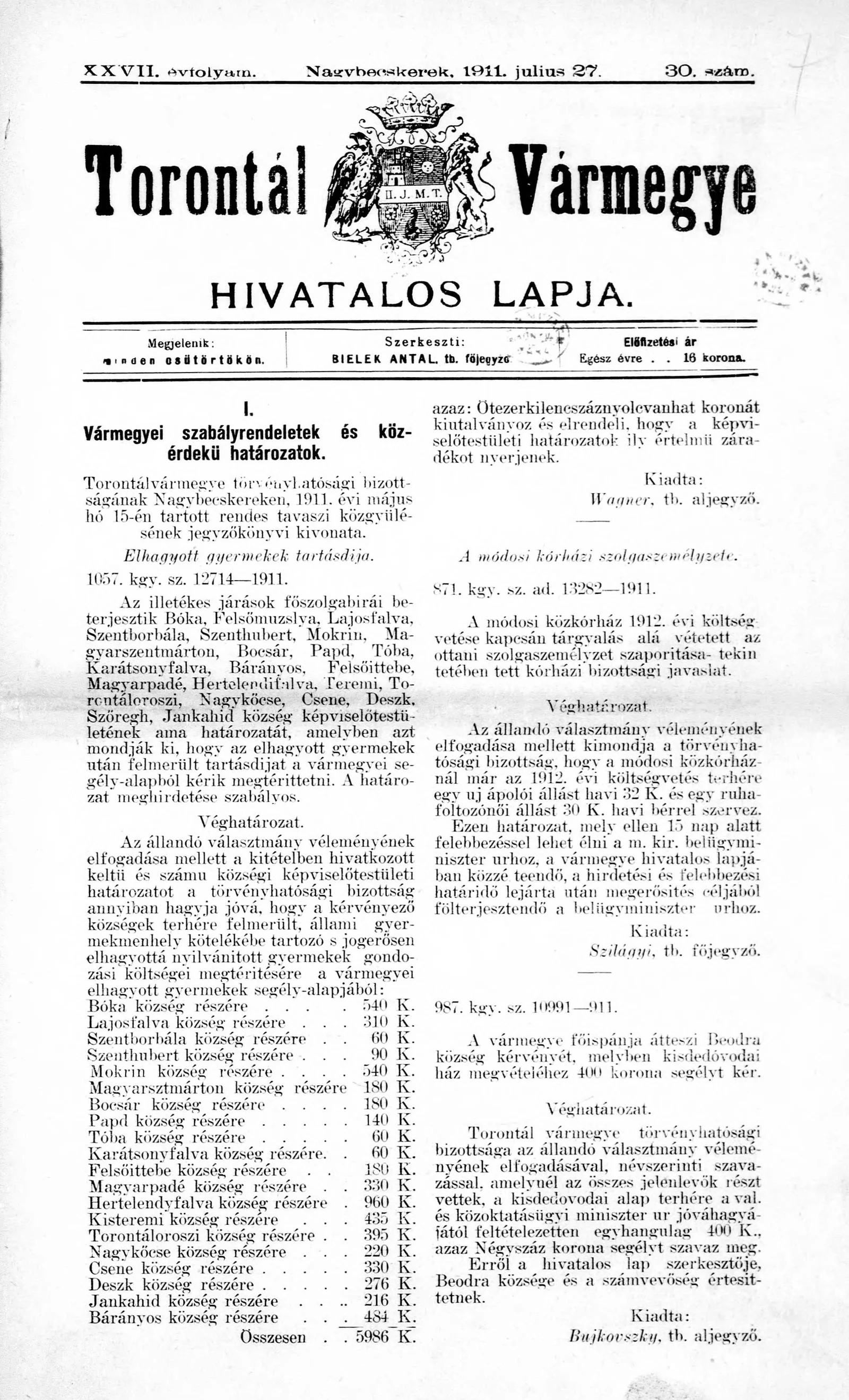 Torontál Vármegye Hivatalos Lapja, 27. évf. 1911. július 27. 30. sz.